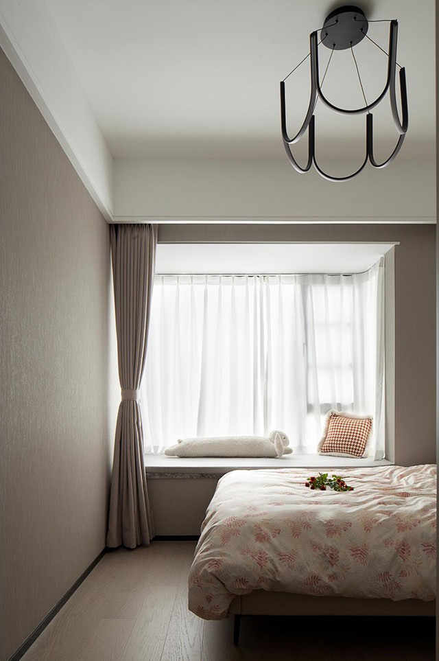 - 窗边做了矮柜+飘窗垫,既是储物区又是“小沙发”,随手放本书、靠垫,睡前躺