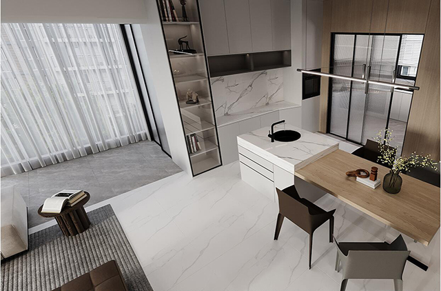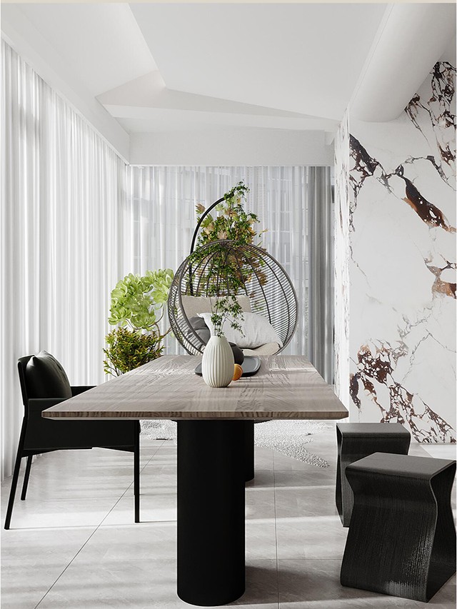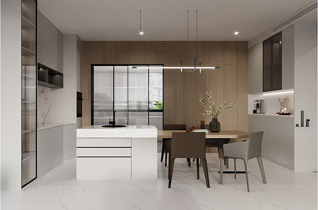 - 餐厨区:白岩板中岛+暖木柜,搭配金属线条吊灯,做饭时的烟火气都变高级;