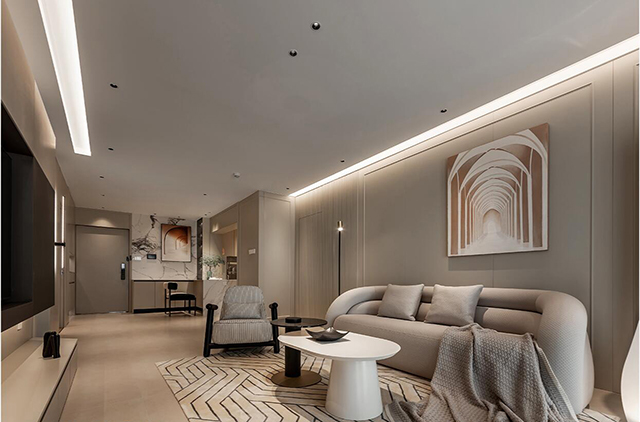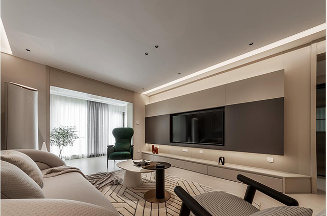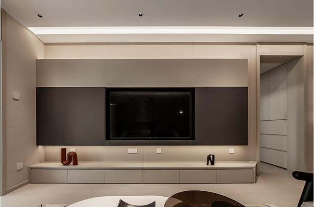 - 细节藏巧思:墙面做了部分竖向格栅+艺术画,简约不单调;悬浮电视柜+隐形