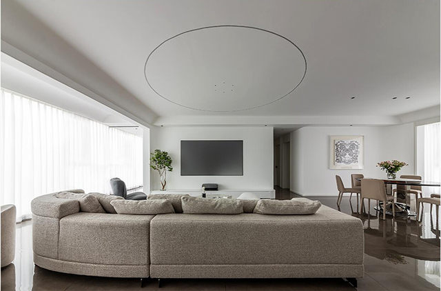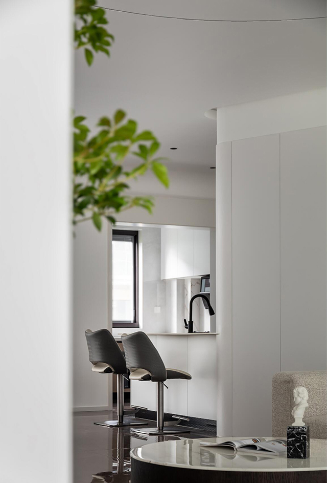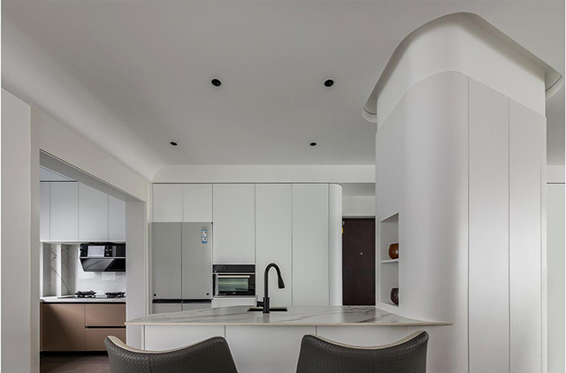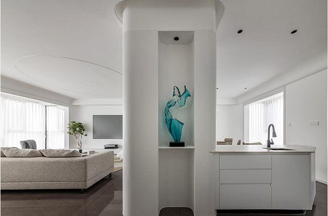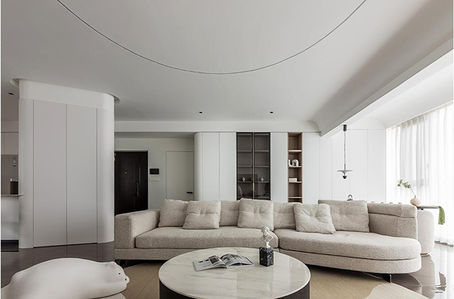 1. 线条要柔: 圆弧吊顶、弧形立柱、隐形拉手,用曲线弱化极简的“冷”;