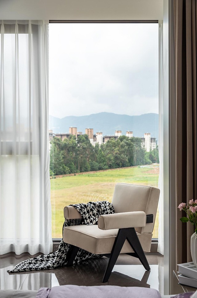 - 靠窗做长条茶桌+矮凳,窗外是山景,喝茶时像把自然搬进了家~