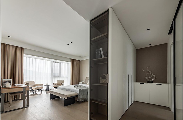 墙面用浅棕+米白拼色,温柔又不单调;整排衣柜做玻璃+纯色门组合,藏起衣物