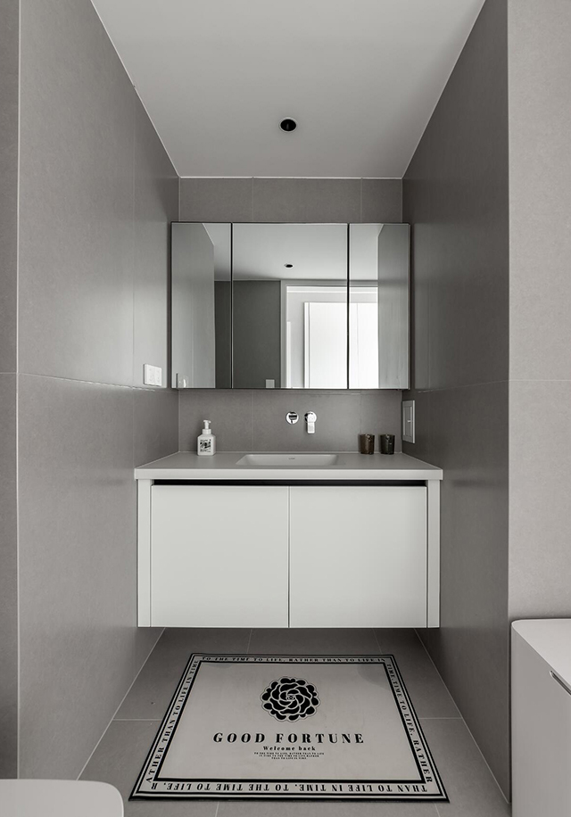 - 卫浴: 浅灰瓷砖通铺+悬浮浴室柜,干净显大还防卫生死角;搭配带字地毯,冷
