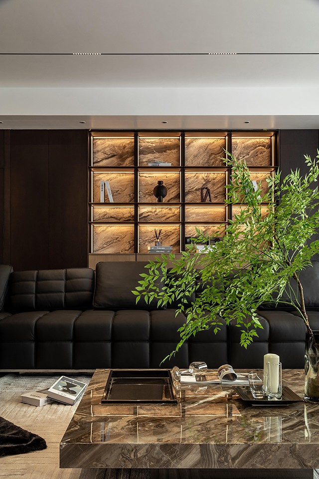 以深咖木饰面+黑色皮革沙发构建核心视觉,整面定制的石材展示柜嵌入暖光灯