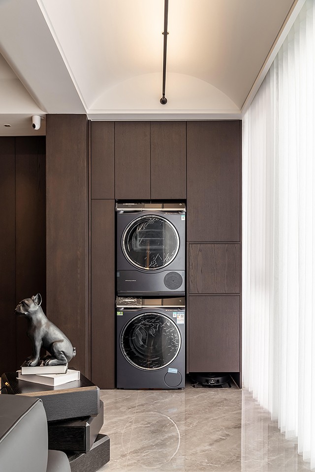 带,弱化了深色的厚重感,反而让空间层次更立体。隐形收纳区嵌入洗烘一体机