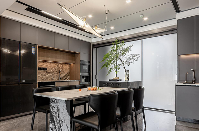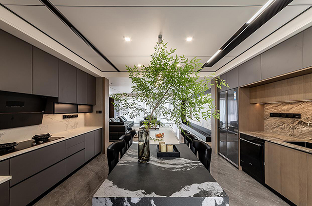 冷硬的石材与木质多了几分生机。中西厨分区设计,兼顾了烹饪实用性与社交互