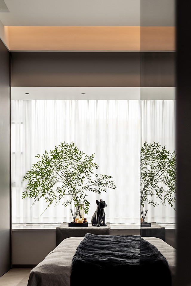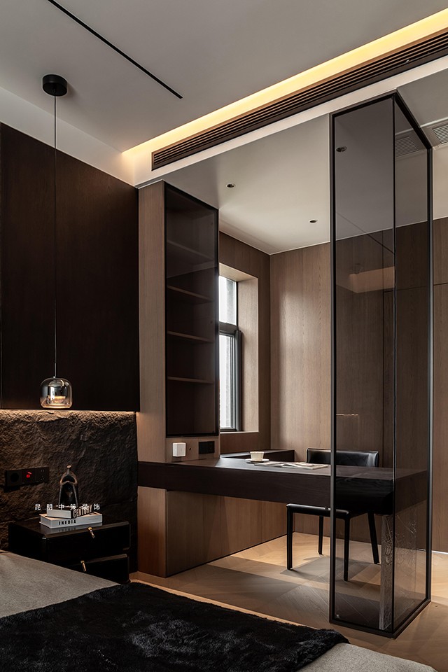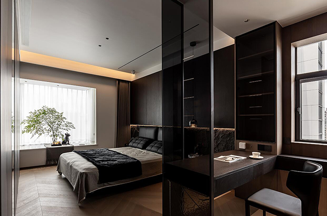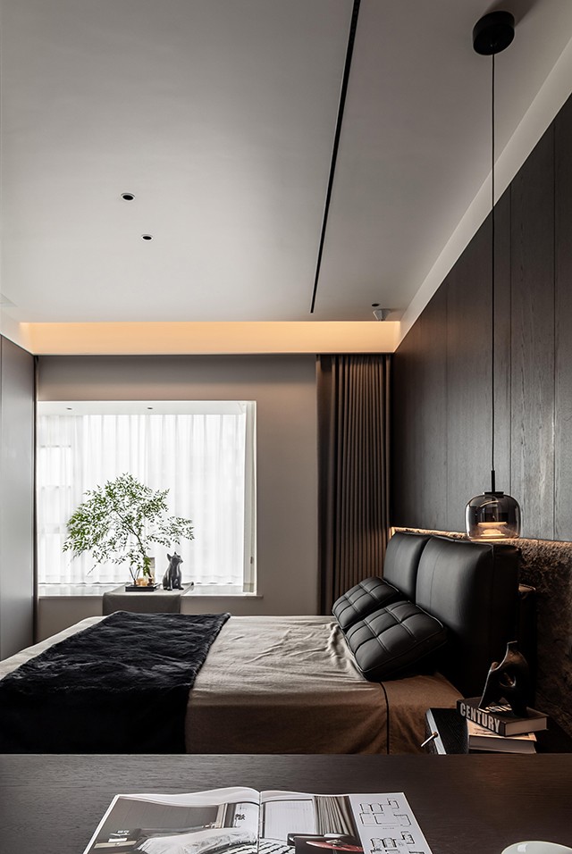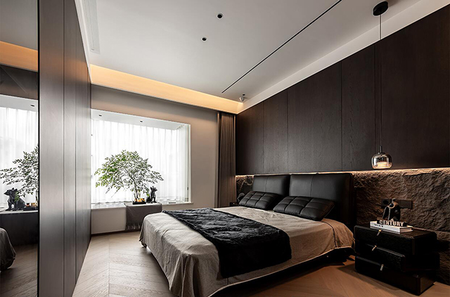主卧延续黑棕主调,软包床头搭配天然石材背景,柔化了深色的冷峻;悬浮式床