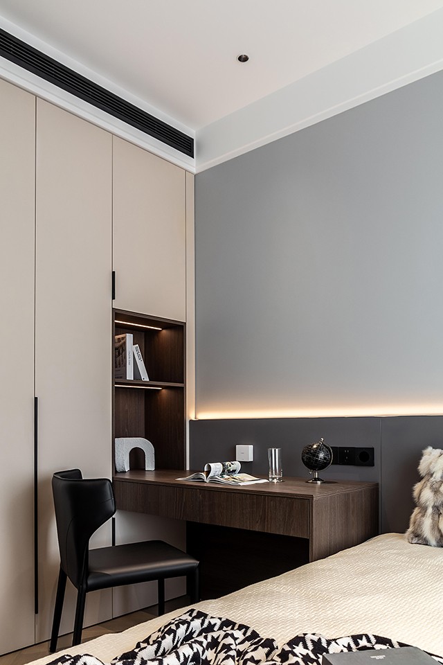 次卧用浅咖柜体与深木色书桌做撞色,线性灯带勾勒出简约线条,在沉稳中融入