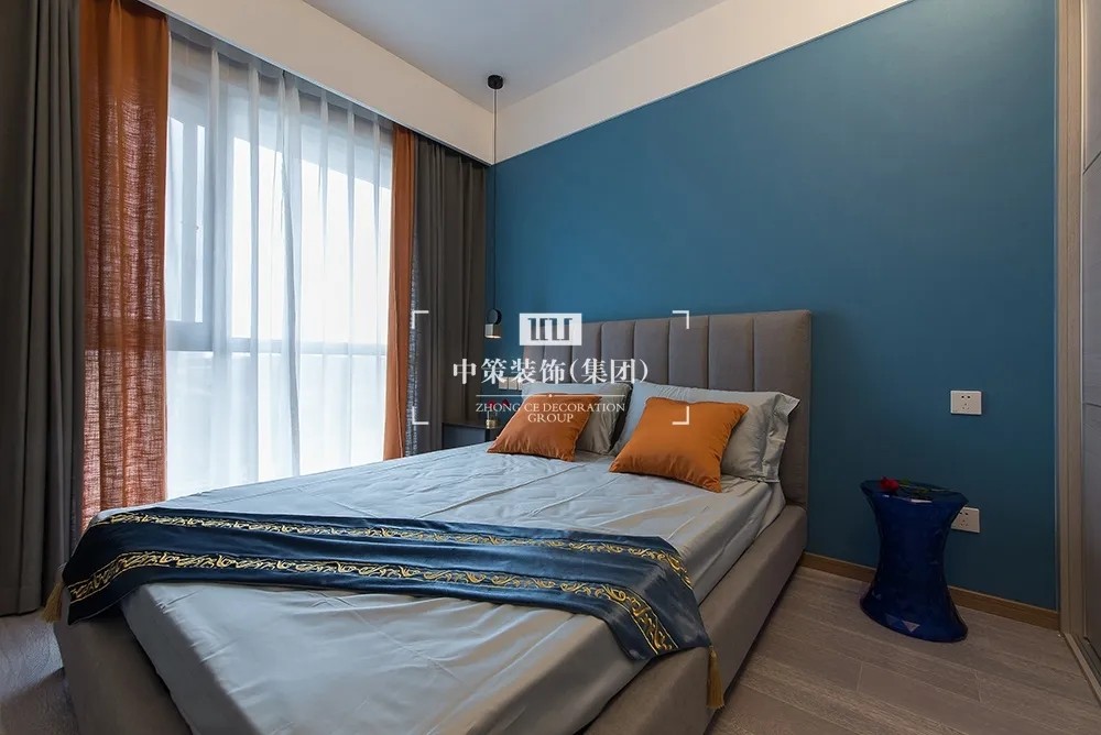蓝、灰色与爱马仕橙搭配,就像是绅士与吉普赛女郎跳起弗拉门戈,时尚而又热辣,画面感别具风味。为业主搭配出想要的时尚轻奢风格