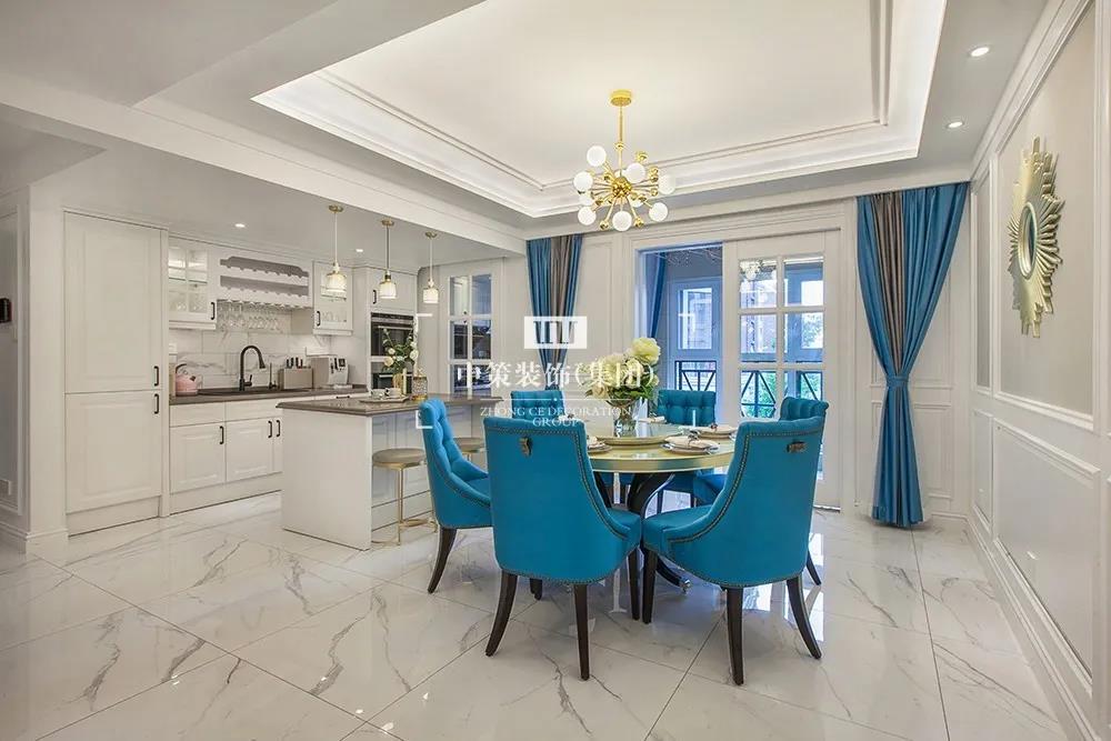 客厅以白色与浅灰色为基础色调,干净明快,灵动的金属光泽巧妙地塑造了客厅的空间感。明亮的主色调搭配鲜艳孔雀蓝的点缀,让客厅在充足的光线下焕发出充沛的朝气与活力。