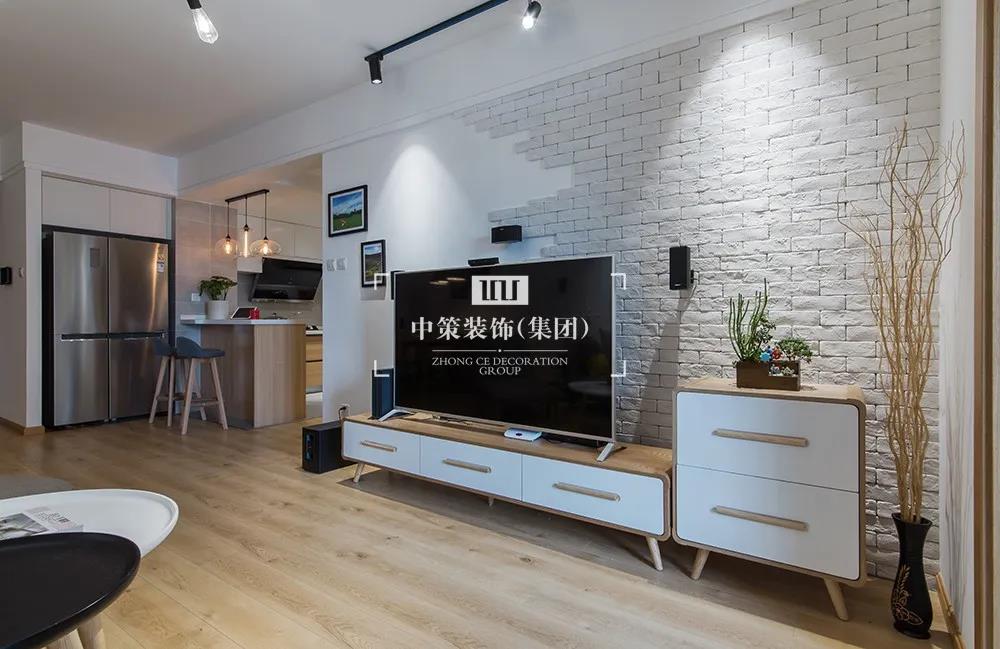 公共区域以白色乳胶漆墙面为主,电视背景墙做了一个文化砖的不规则铺贴。家具跟柜体选用原木色搭配白色,整体随意舒适。