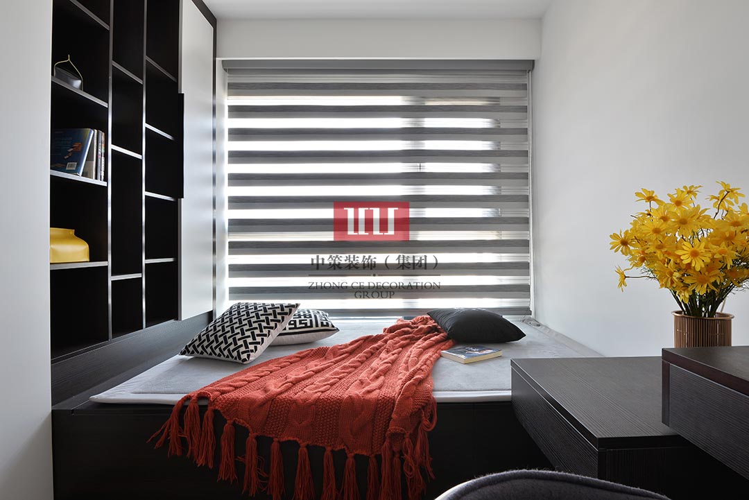 本案中,装饰元素少,大量留白。白色是永不过时的流行色彩,简约实用。客餐厅墙面白漆为底,没有使用过多的颜色与造型,让空间回归最初形态;实用主义的严肃理性碰撞主题的喧嚣放肆,橙色谷仓门增加了房间的灵动性,传统工艺结合现代设计理念融为一体,遥相呼应。一切装饰都回归自然,少即是多。舒缓的设计特色,注重空间色彩以及形体变化的挖掘。也许是一束花,也许是一道光,也许是一桌饭菜,把生活过成心悦的样子!