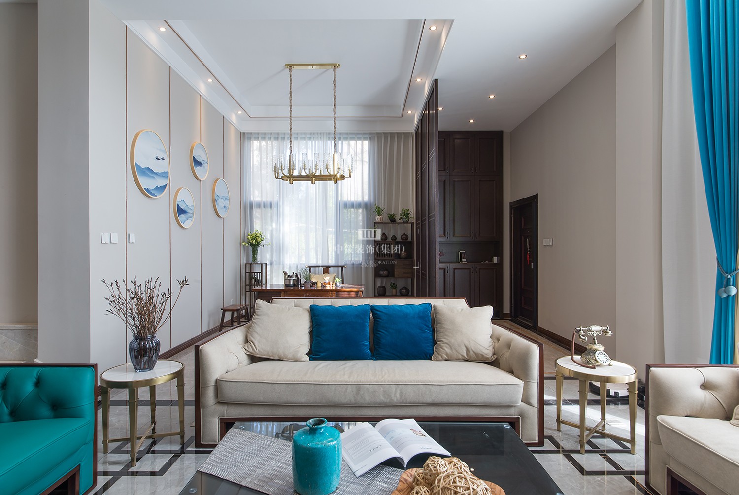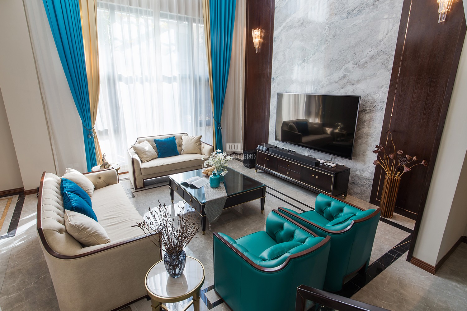 客厅大理石背景墙的设计,格调典雅质朴,韵味浓烈悠长,散发出亦古亦今的层次之美。整体浅色调为主,一抹蓝色作为亮色点缀,使整个空间更加典雅、唯美。