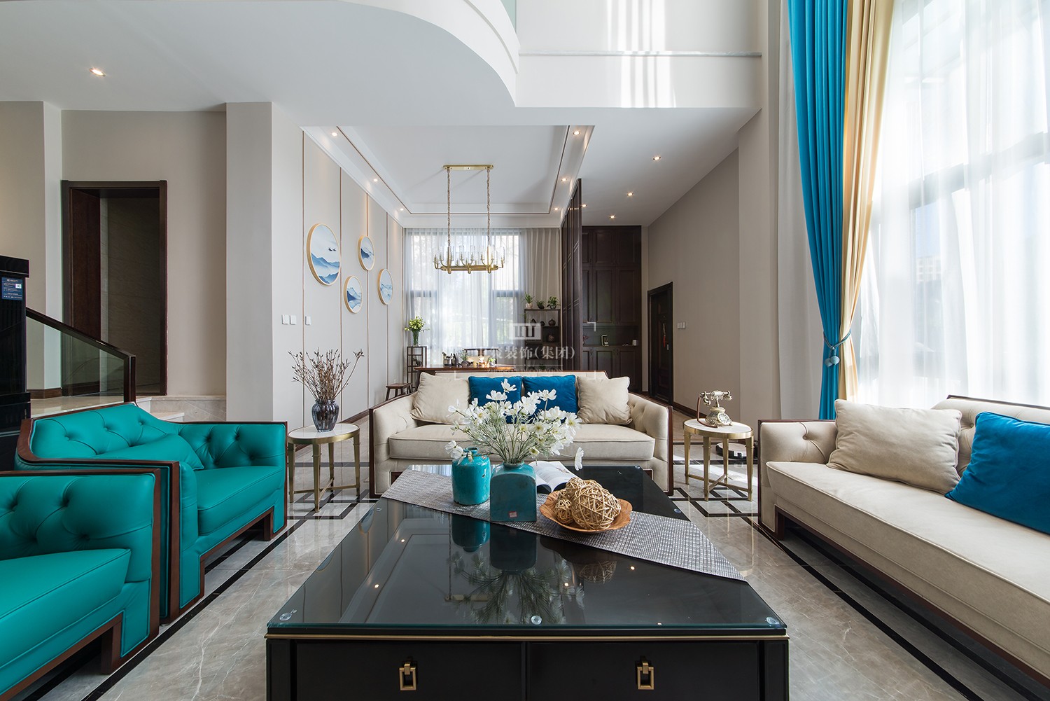 此案的别墅装修,中空客厅开阔通透、空间感良好,家具围合而坐,保证舒适度的前提下,又加强一家人的互动。