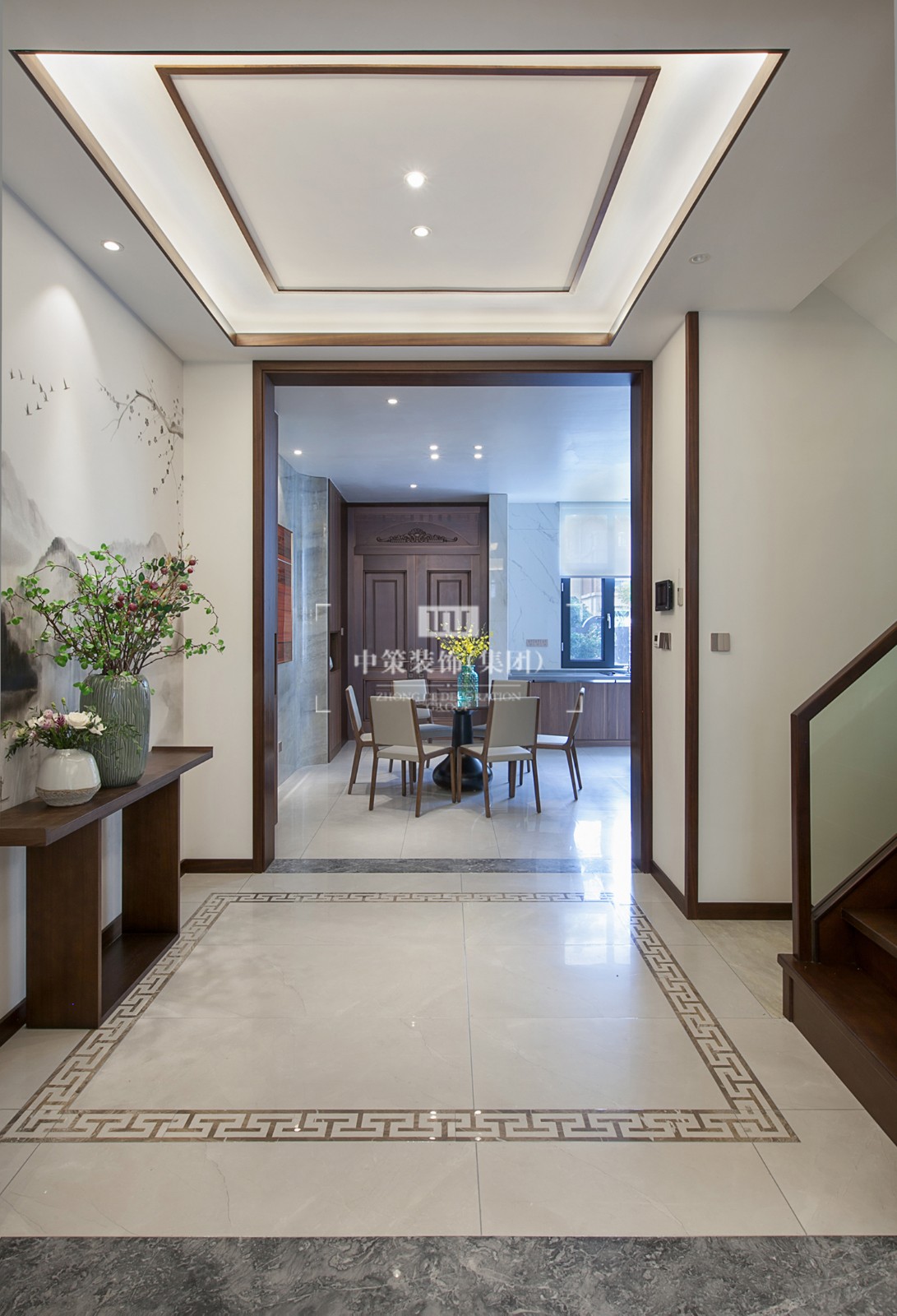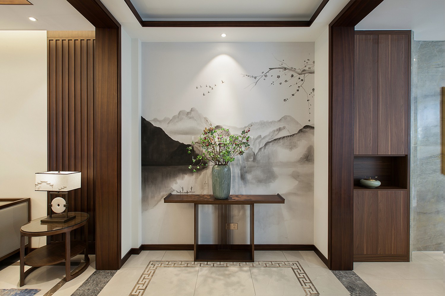 过道背景墙上的水墨山水画,淡逸劲爽,山水元素始终贯穿中式风格。设计师通过不同空间的表现形式,传达古韵雅致的意境。
