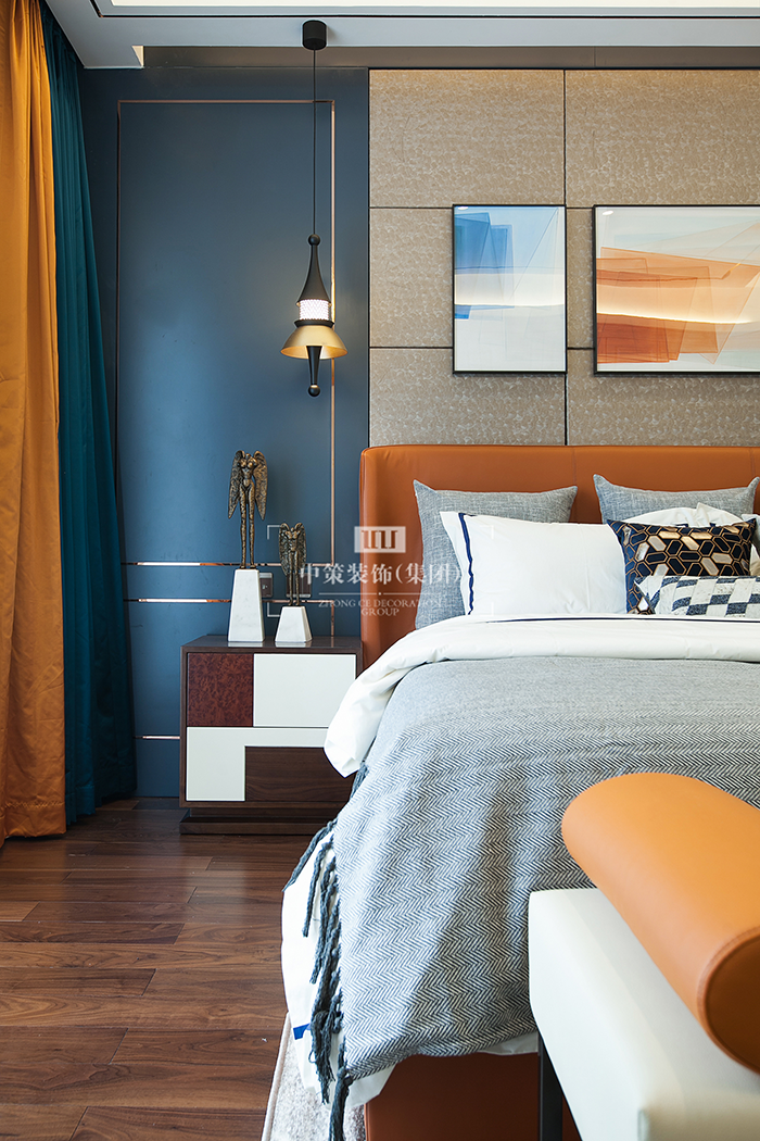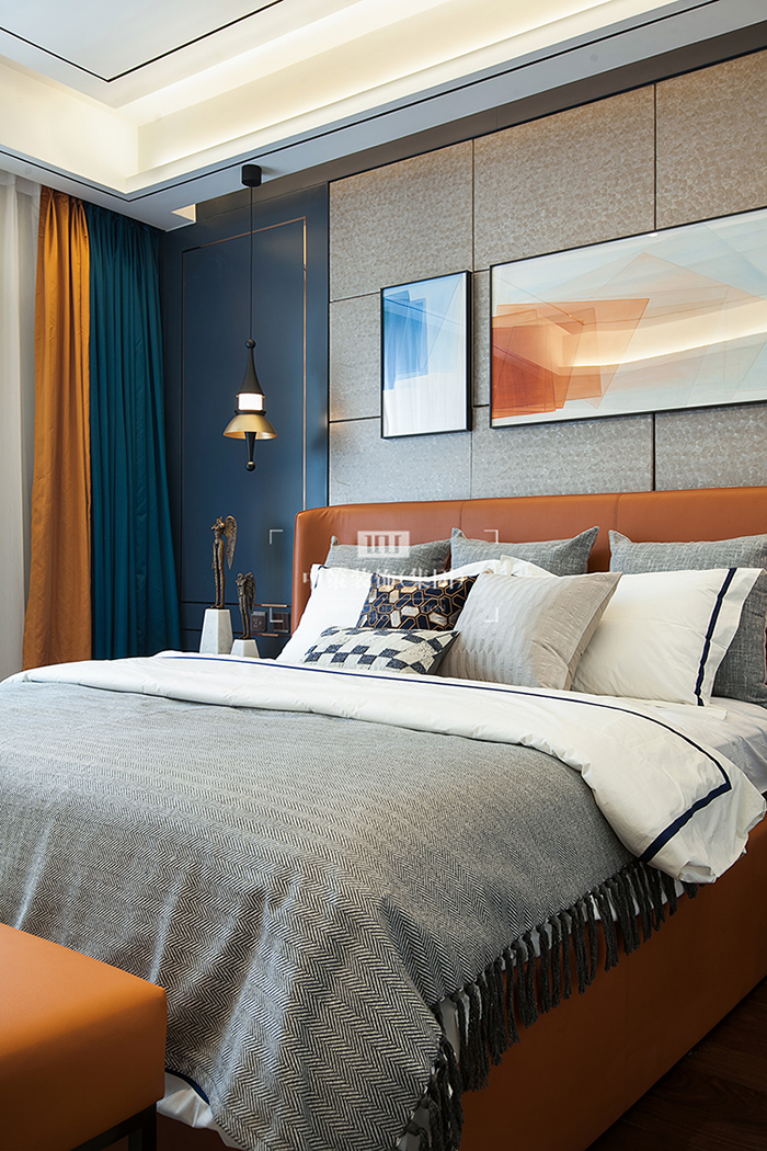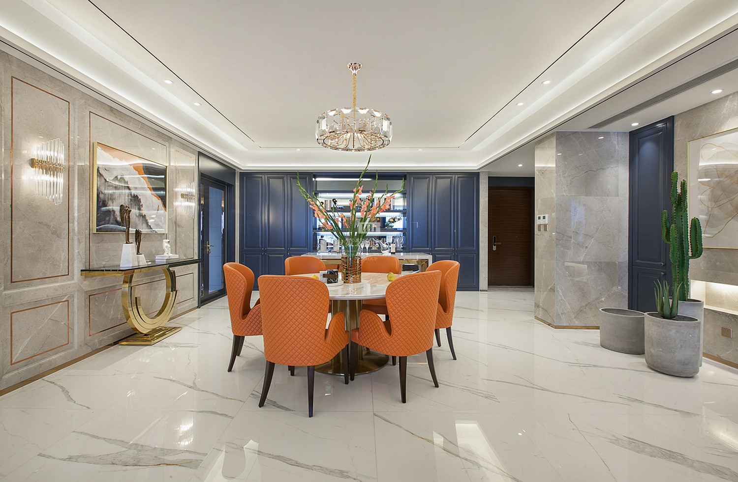 色彩选择上,不同的蓝色调互相穿插,跳跃却又温和,再加入暖色系的橘色,给贵阳别墅装修增添一丝生活的温度。