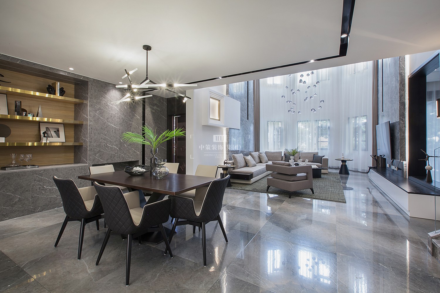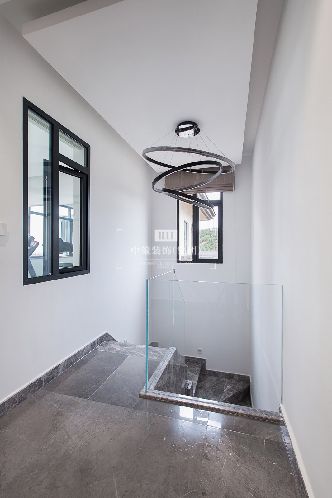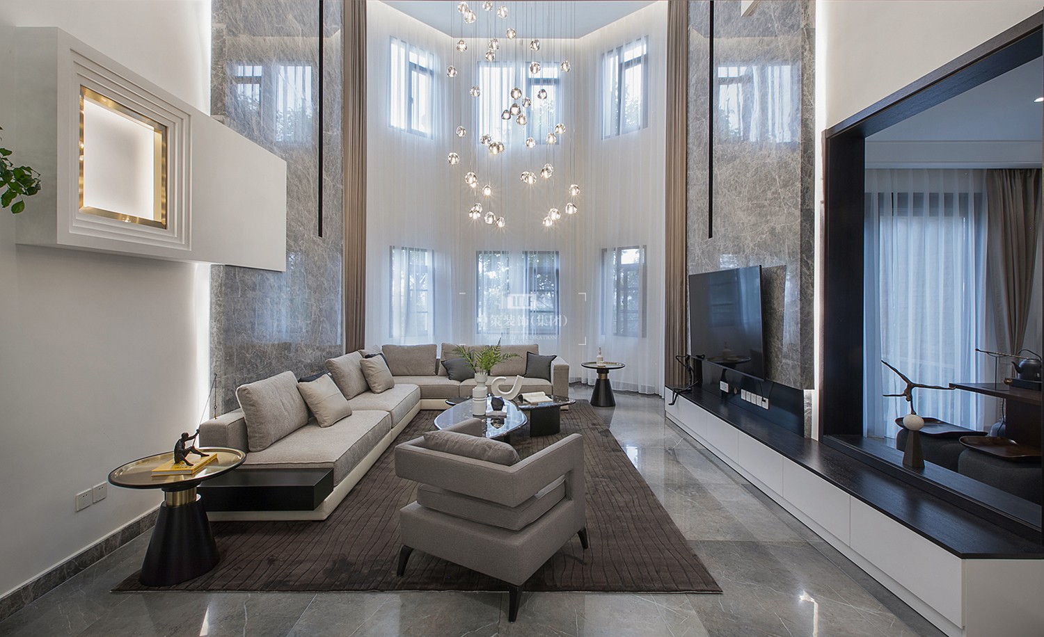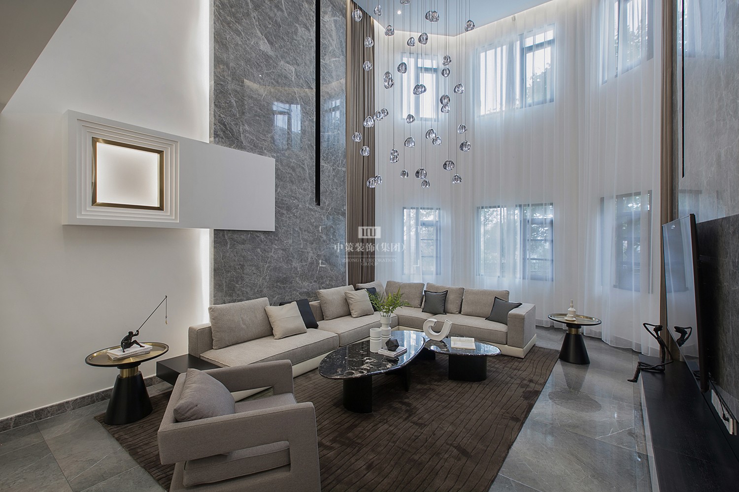 中空客厅是该户型最大的特点,挑高的天花板采用围合的设计,捏塑空间的立体感;水晶吊灯倾泄而下,铺陈大气风范。