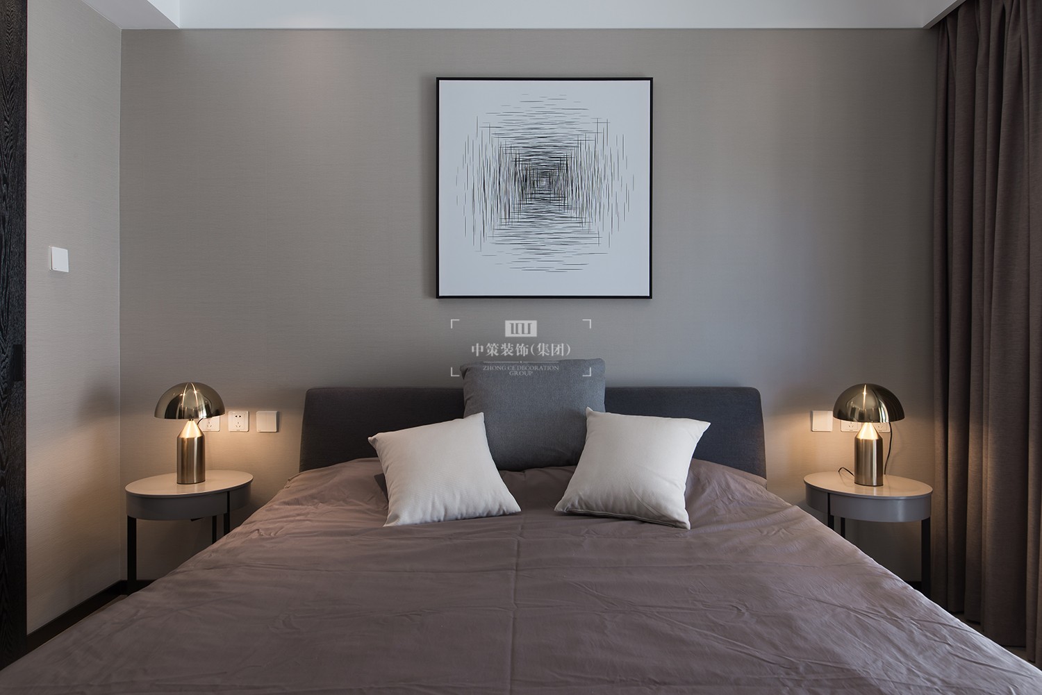 软装配饰家具皆对称布局,家具造型简约,黑色、灰色的暗色调家具在浅色调的背景之中呈现空间装饰重点。