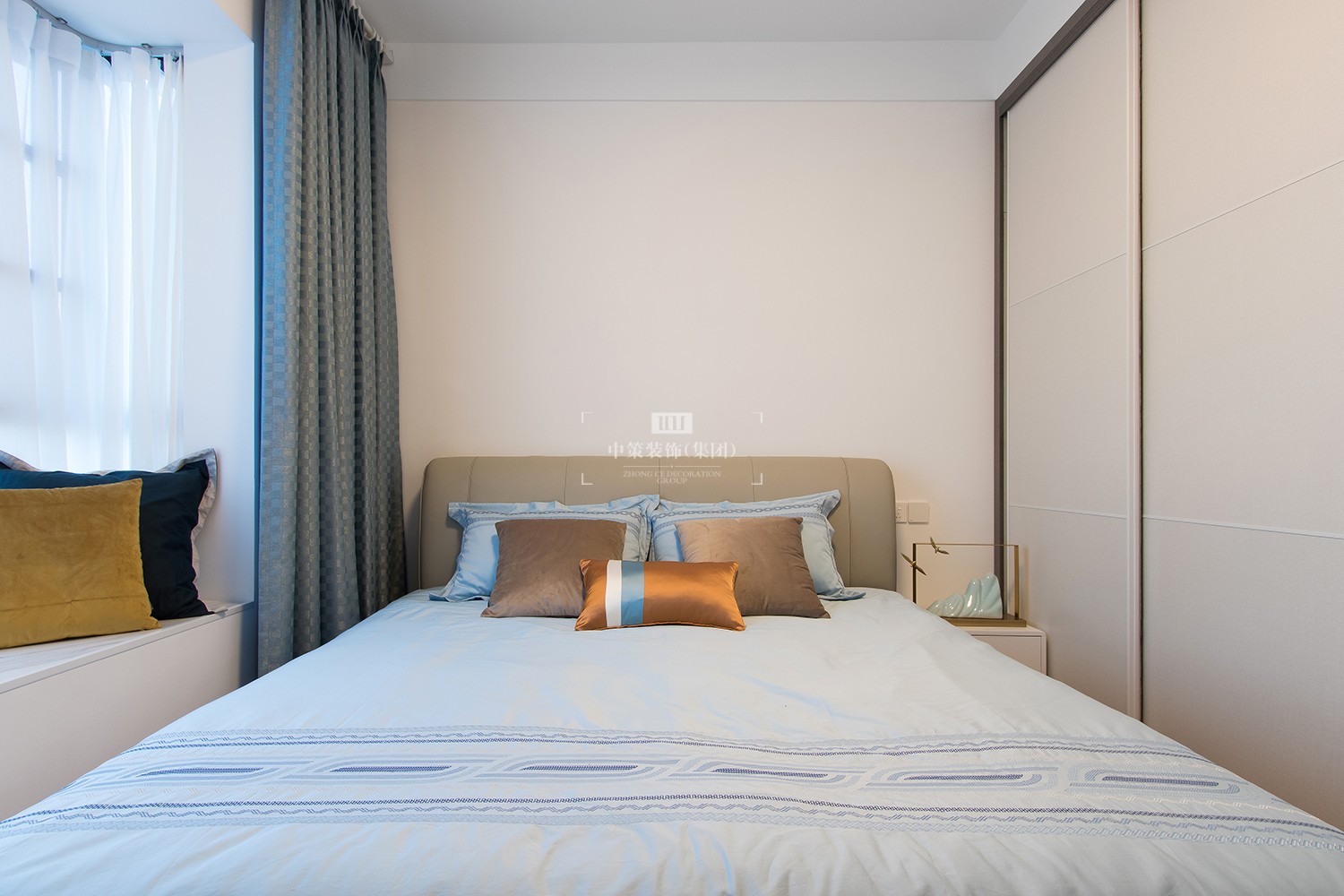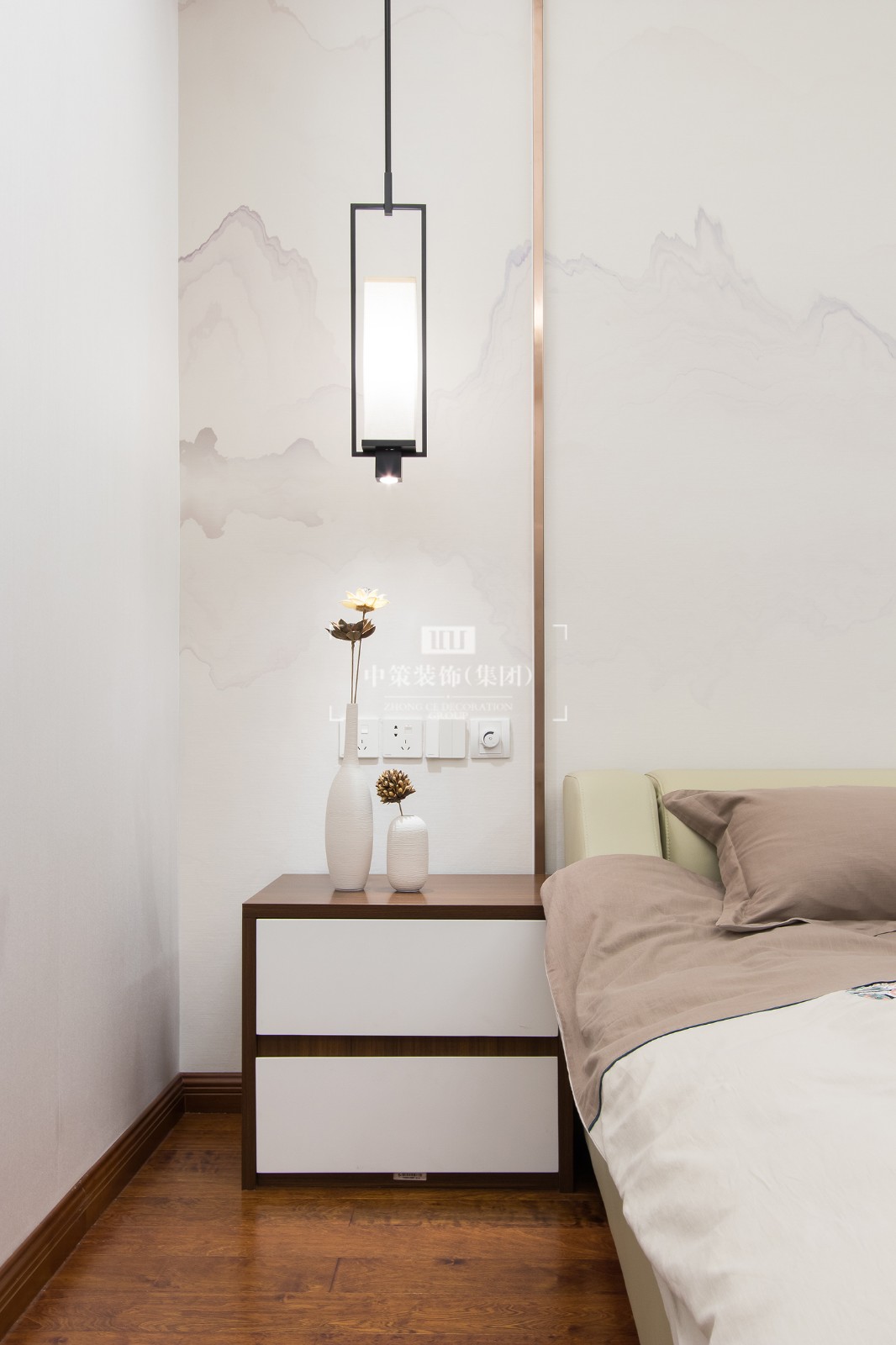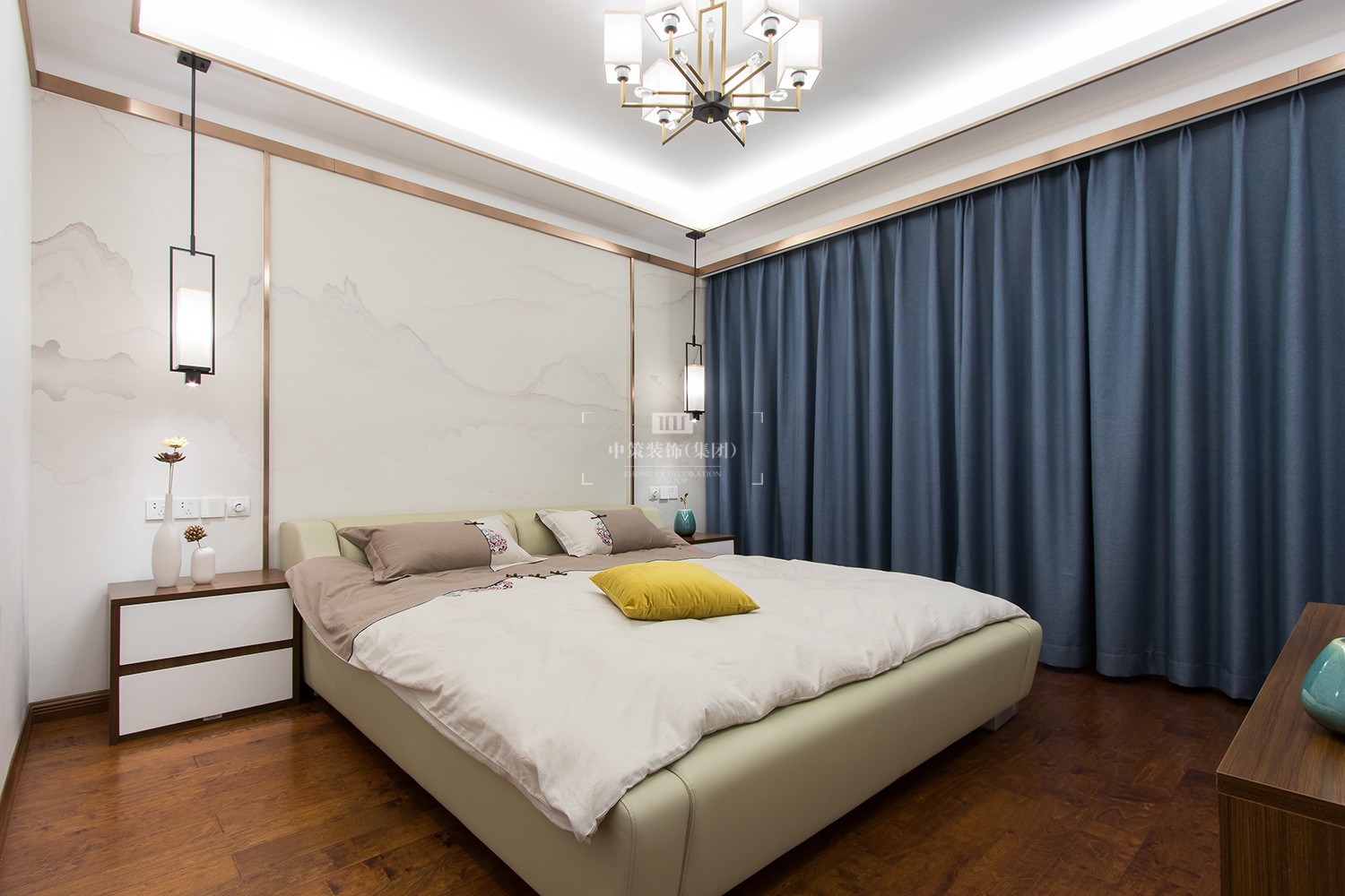 主卧室金属边缘的吊顶、大理石墙面,精致的软装配饰,带给主人柔和舒服的休憩体验。