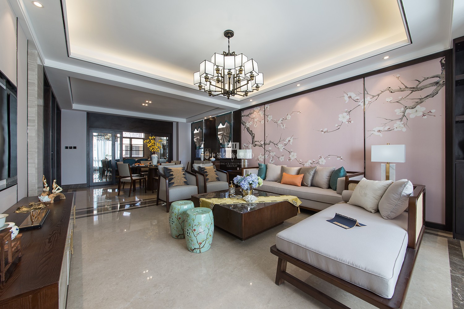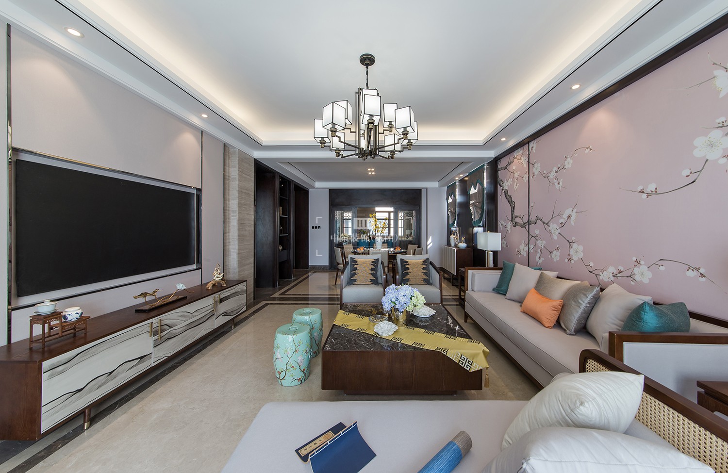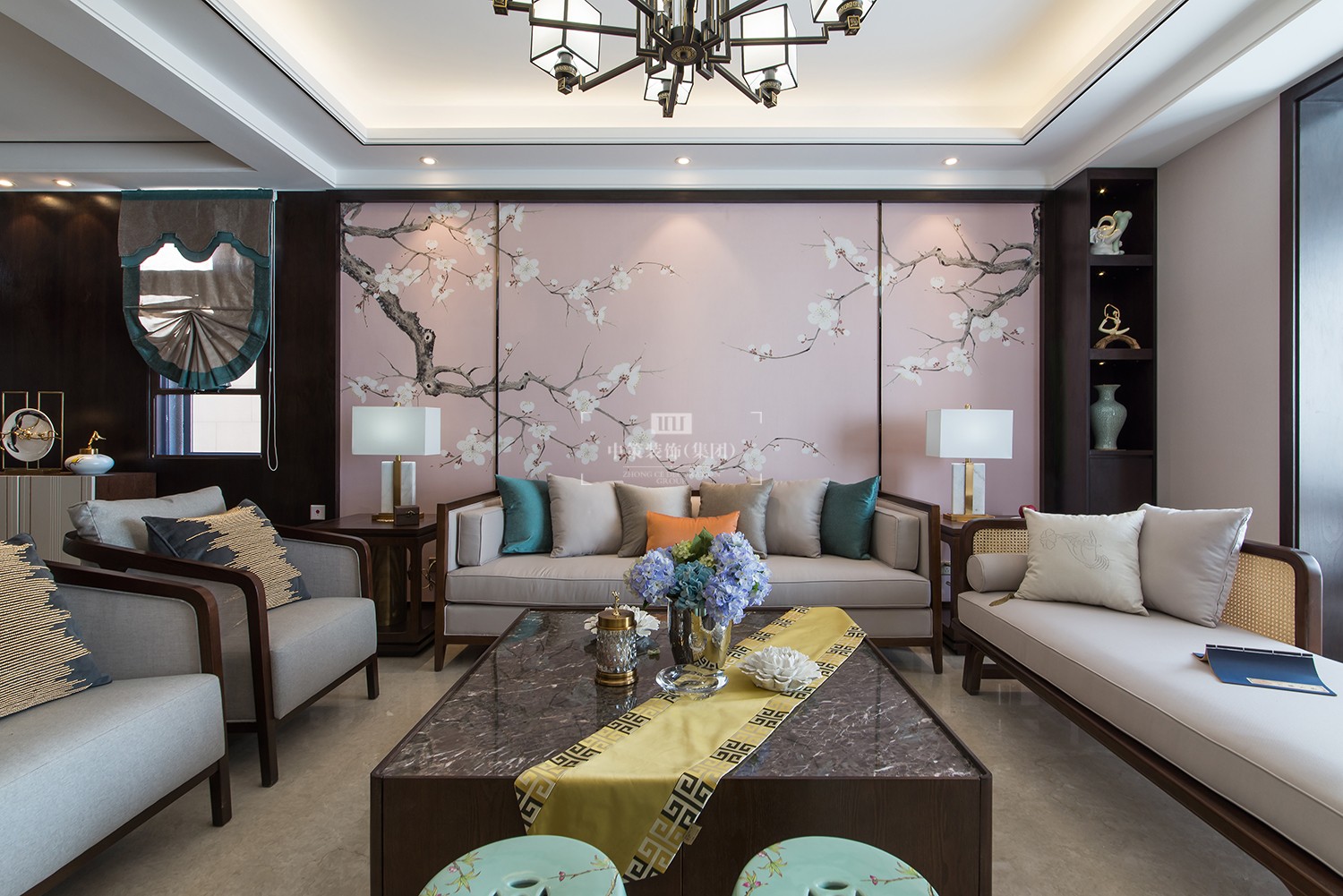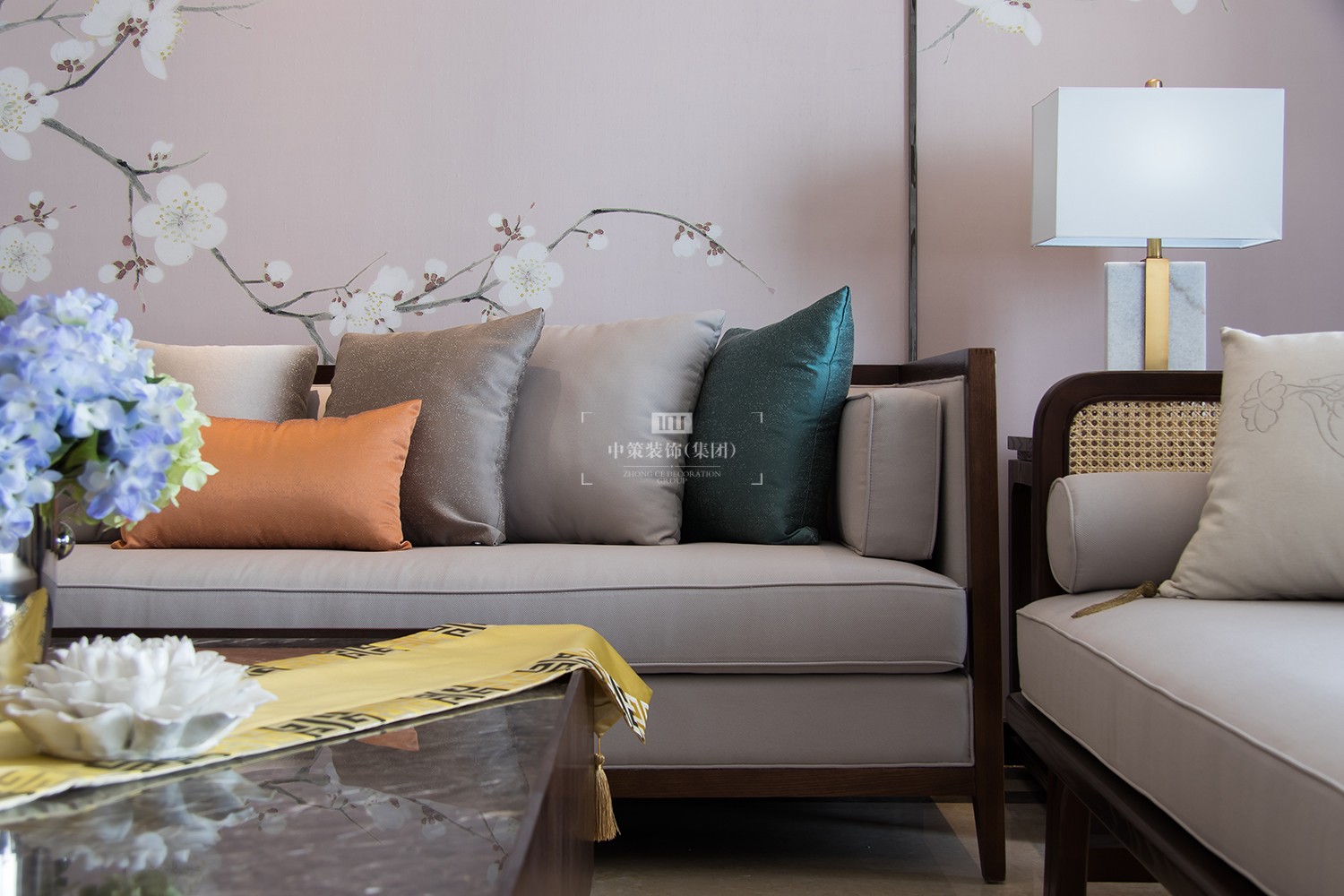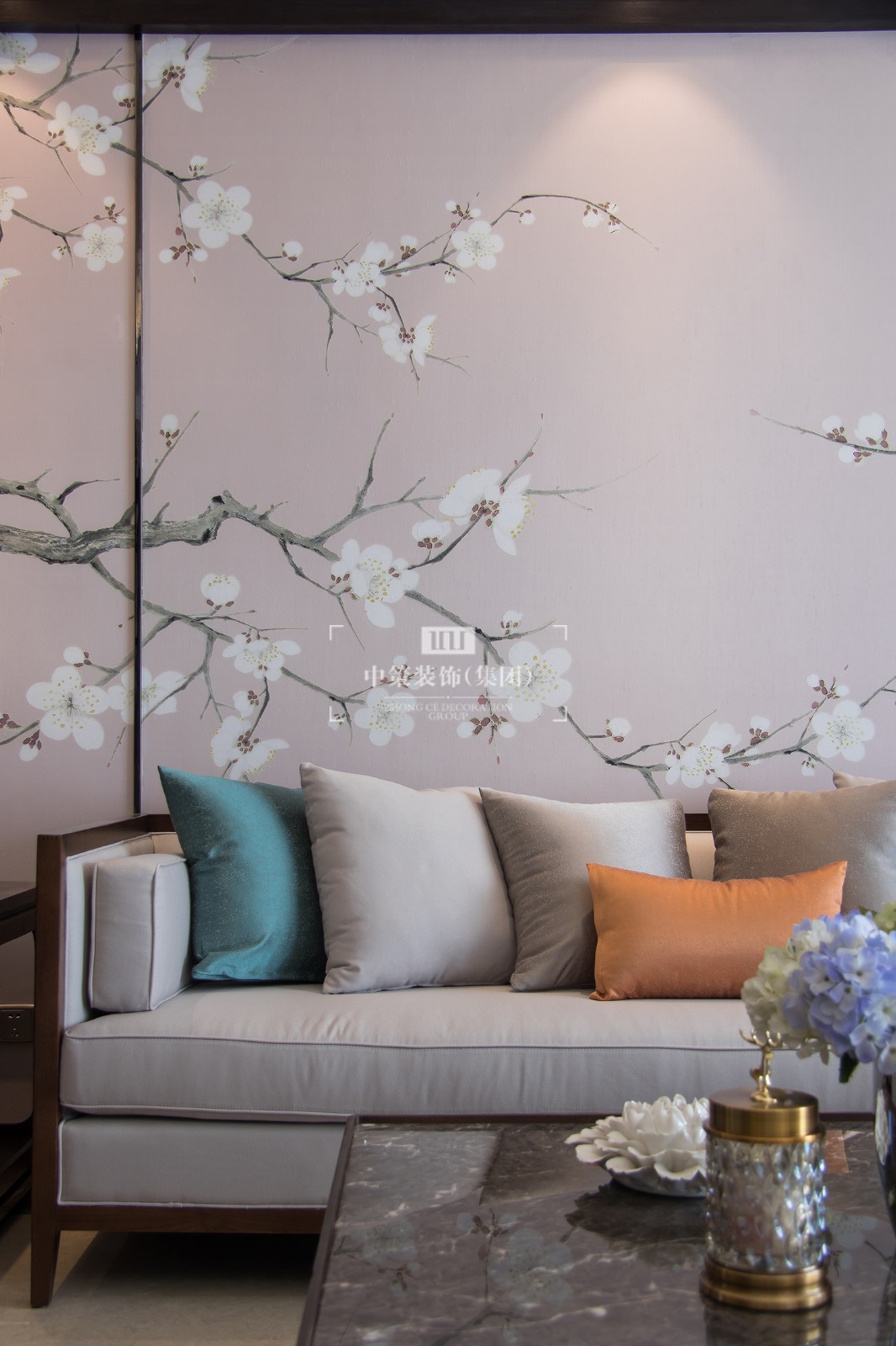 走进客厅,第一眼就被墙面上的花卉背景墙所吸引,自然的精致营造出清逸雅秀之趣。(中策装饰实景案例图)