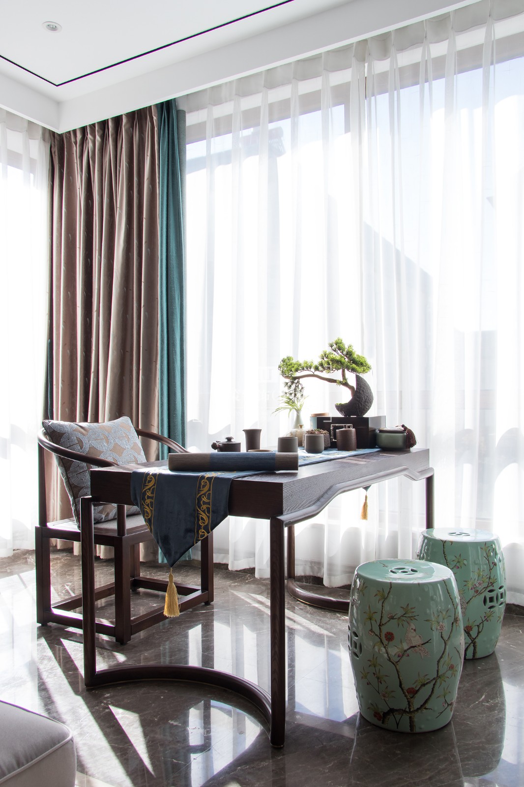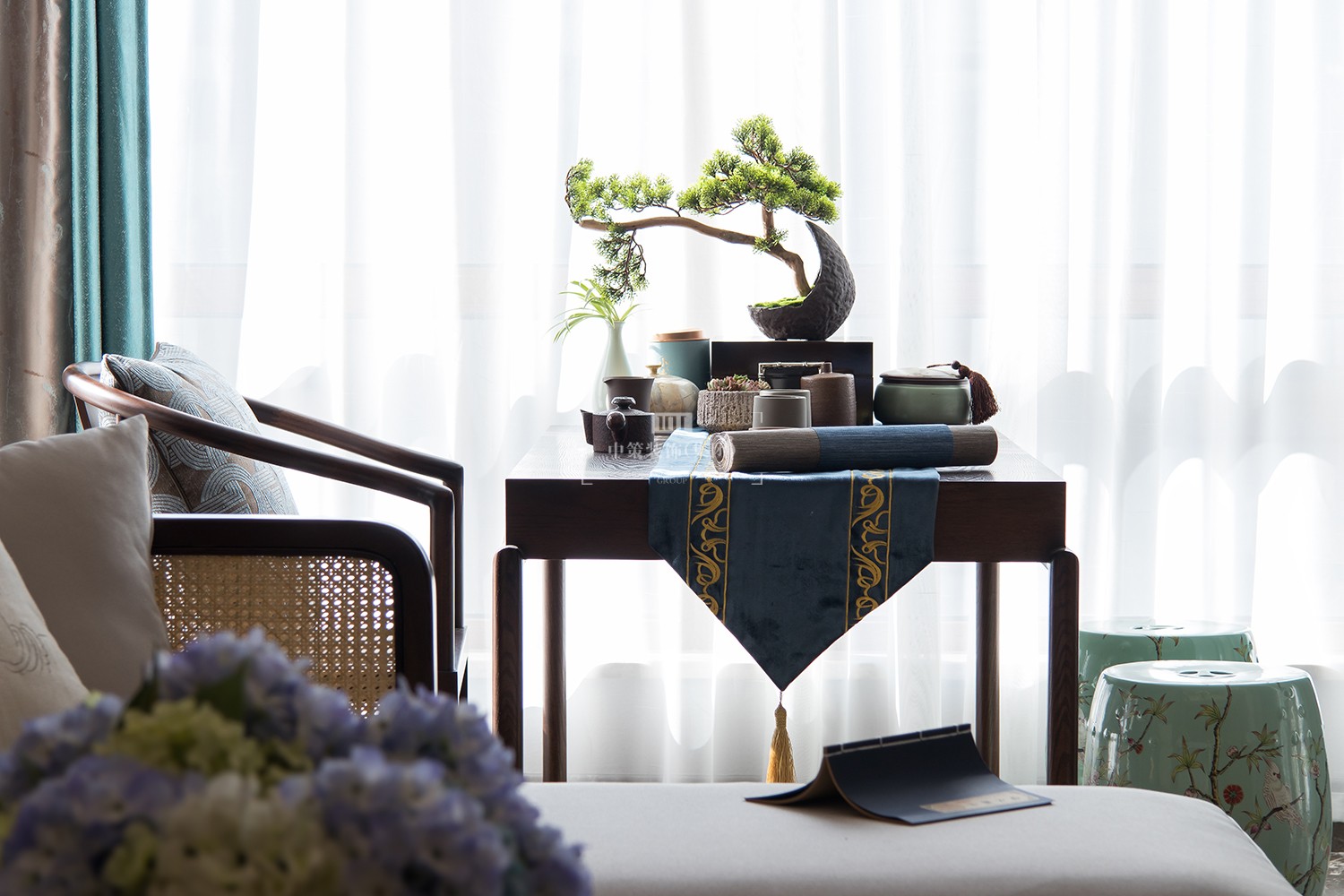 茶台空间自然雅致,盆栽小景、石凳体现主人不俗的品味外,更营造了静谧的空间以供思考、交谈。(中策装饰)