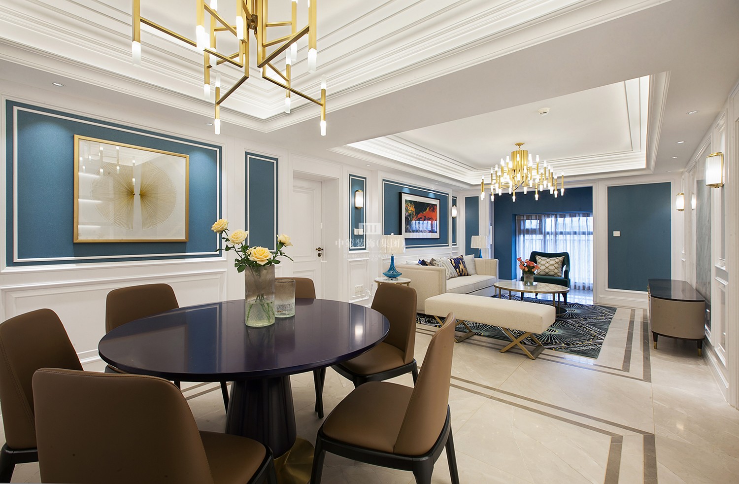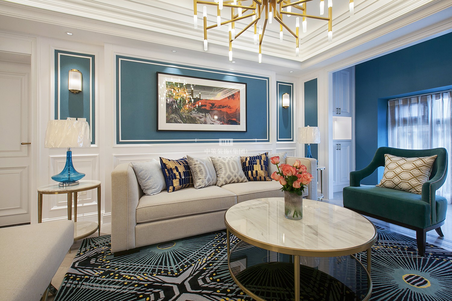 客厅亮白色的墙面与孔雀蓝墙纸相结合,搭配品质不凡的家具,让住宅变得浪漫、优雅、舒适、自在。