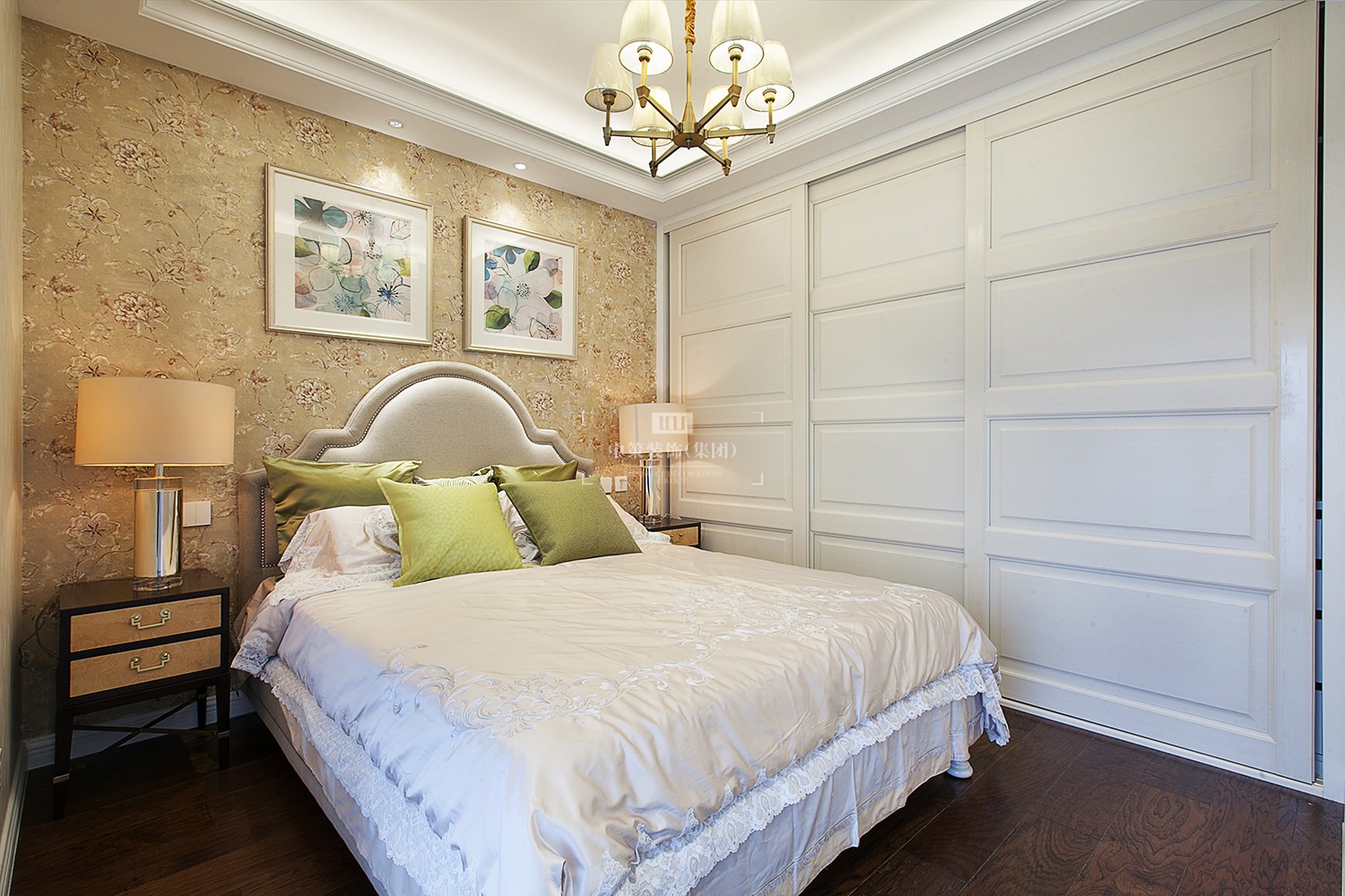 主卧室的整个空间动态流线丰富,栗色的木质地板使得空间更加柔和,营造的温馨浪漫氛围浸透出主人对精致典雅生活的追求。