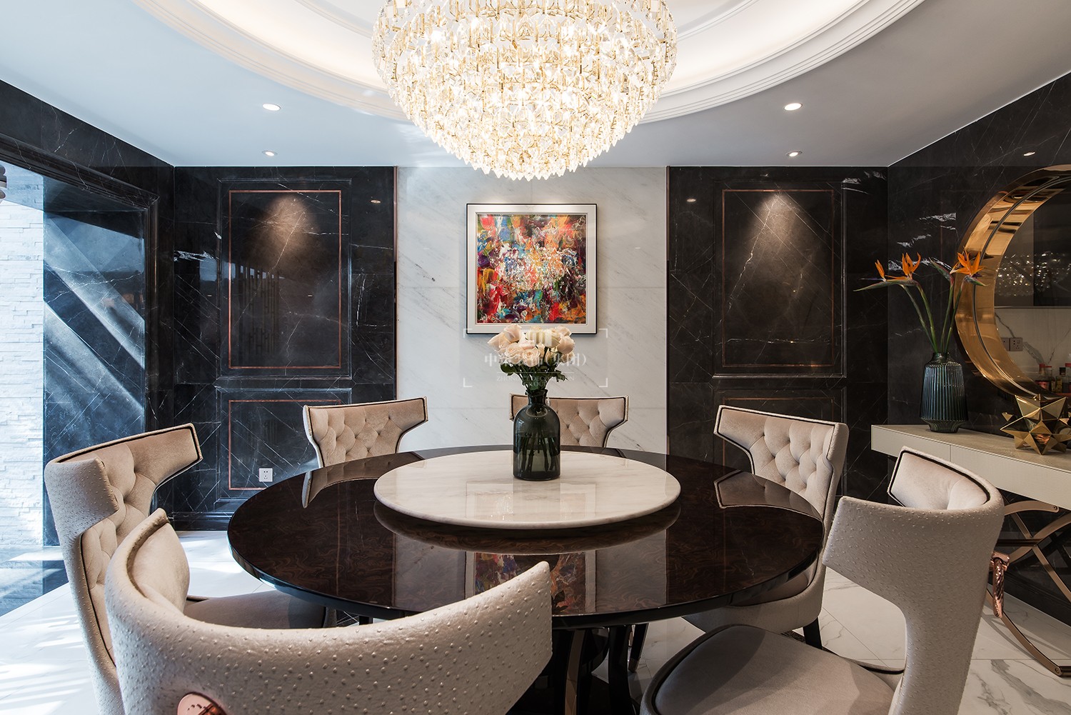 家具软装的搭配延续建筑及室内时尚奢享风路线,以此为基础环境,续写丰沛的美学力量空间,以匹配财富阶层应有的生活方式。