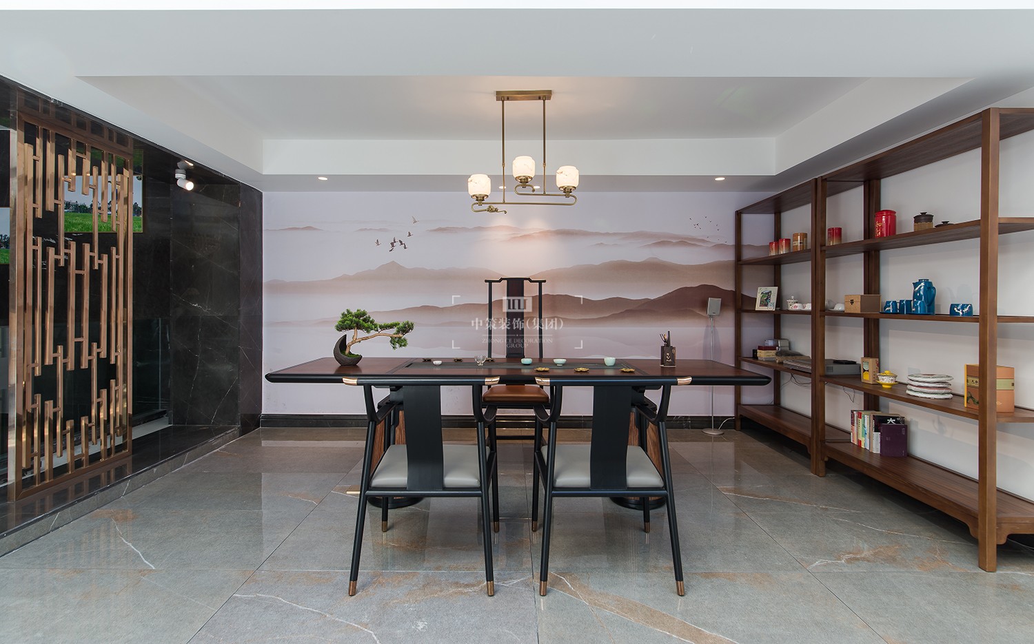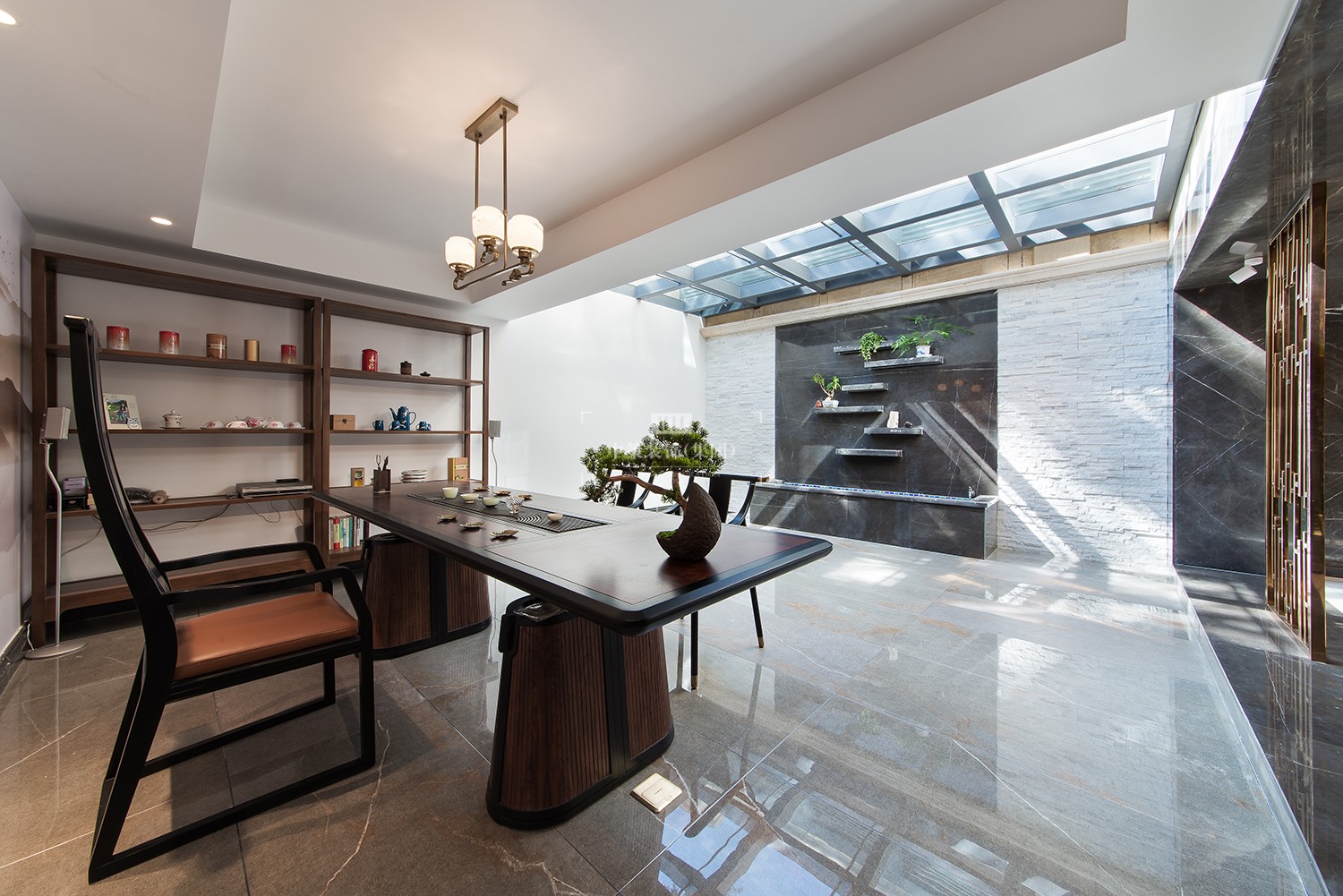 餐厅、庭院、书房、茶室,四者之间利用隔断模糊界限,配上绿植与饰品,空间相互借景;室内室外水乳交融,让用餐、品茶、读书仿佛置身于大自然,给高压快节奏的城市生活增添了一抹绿意。
