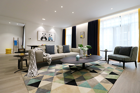 本案的创作灵感来源于格林童话中的“森林小屋”,整体色调运用北欧地区自然现象——极光的颜色,用地毯作为呼应。