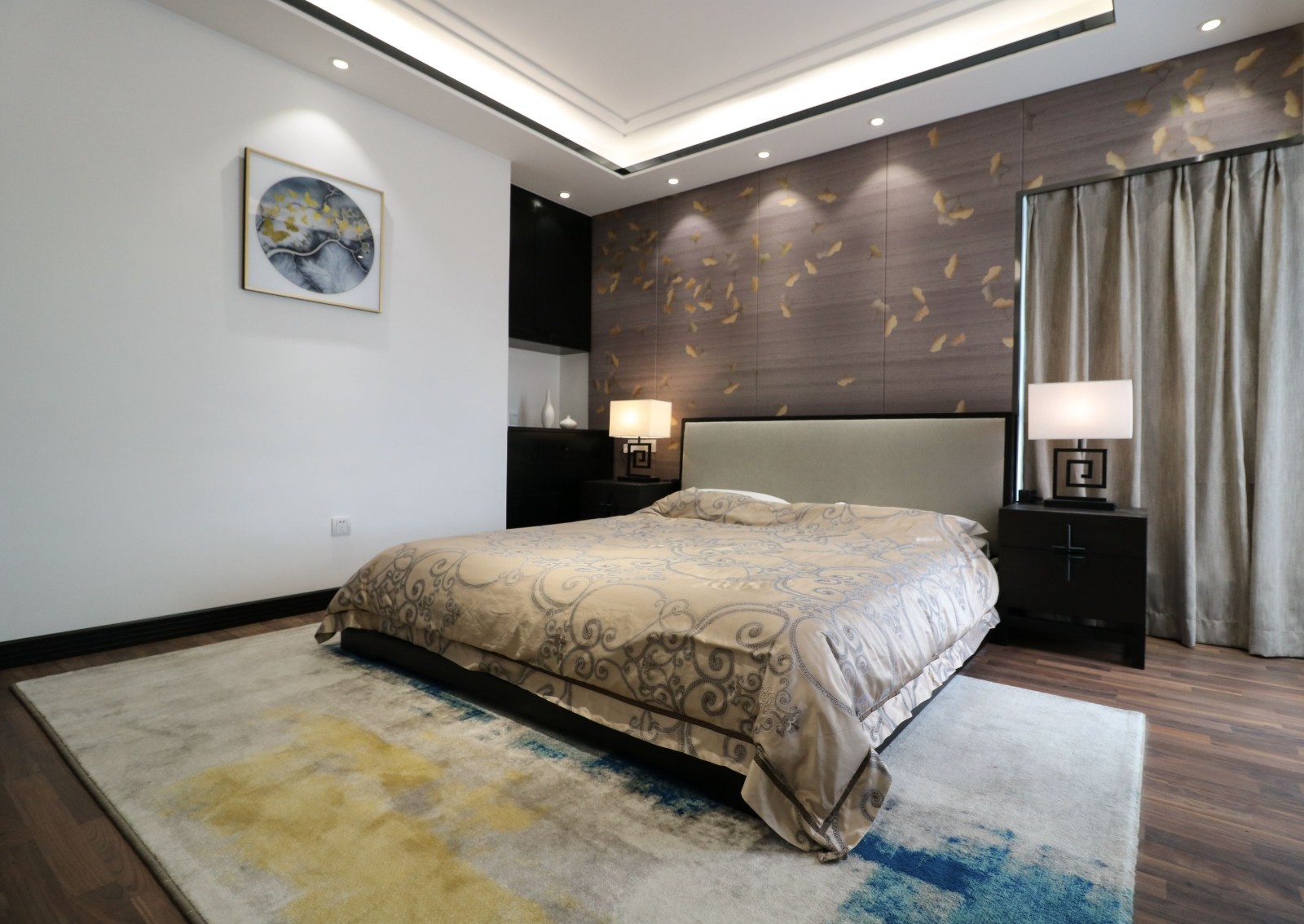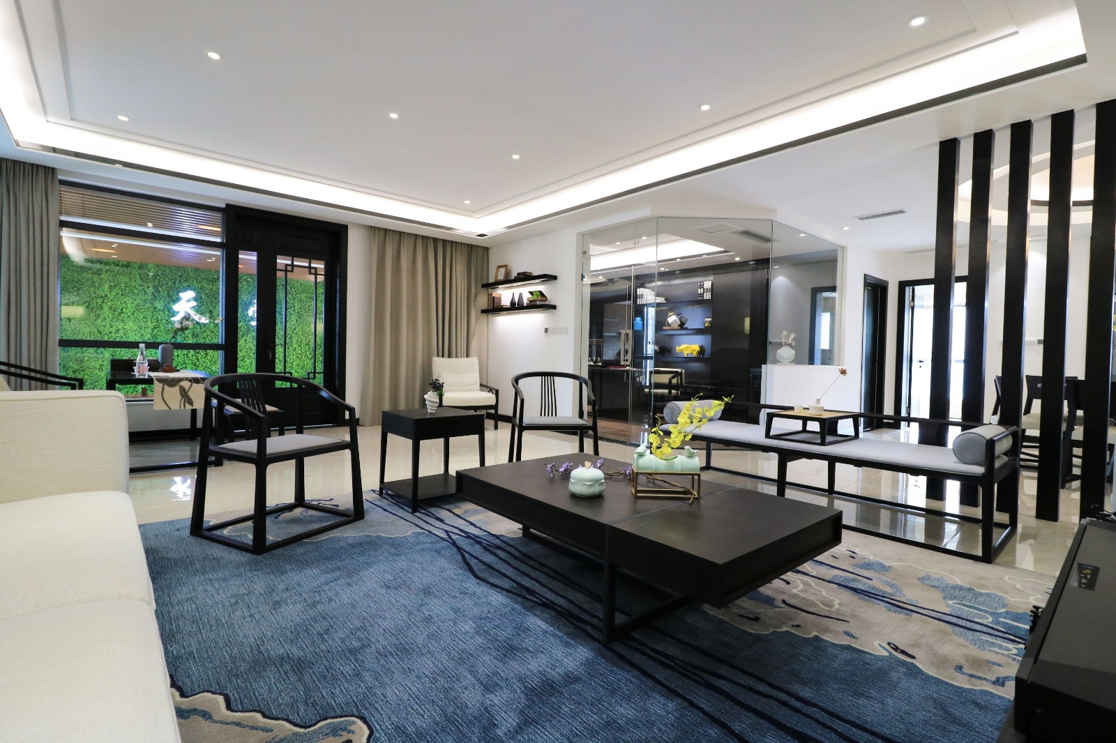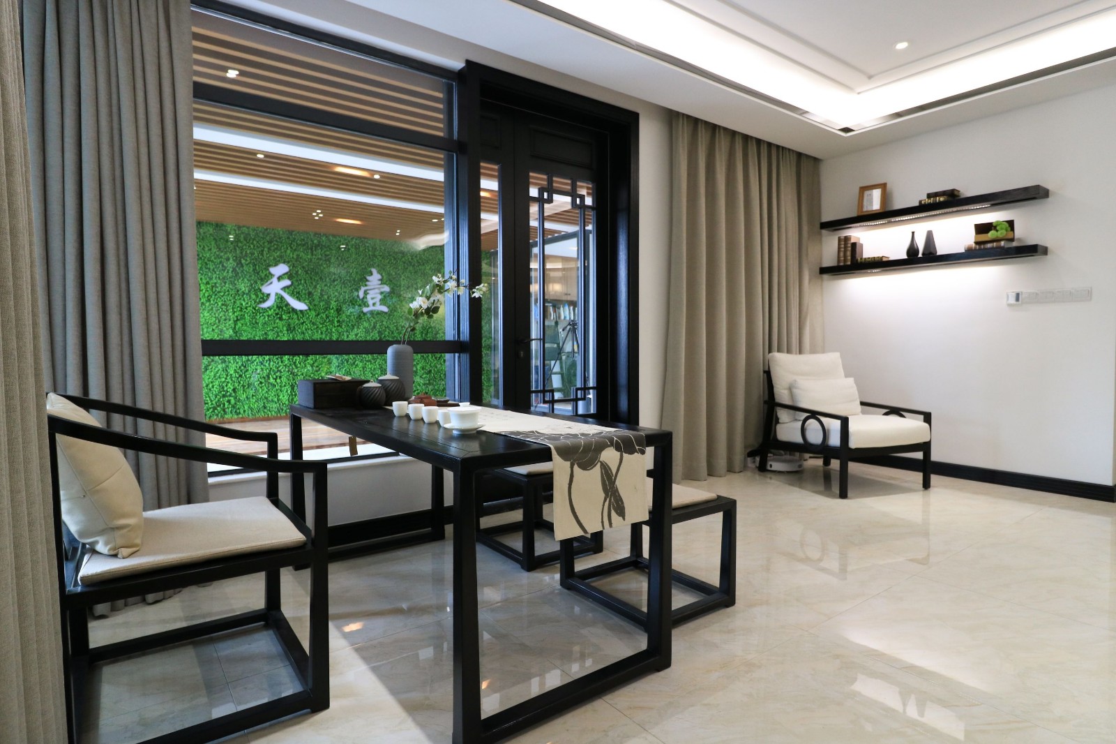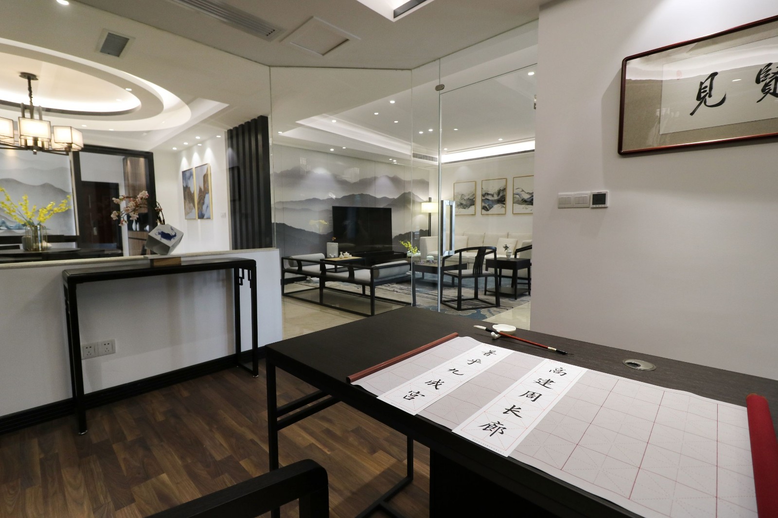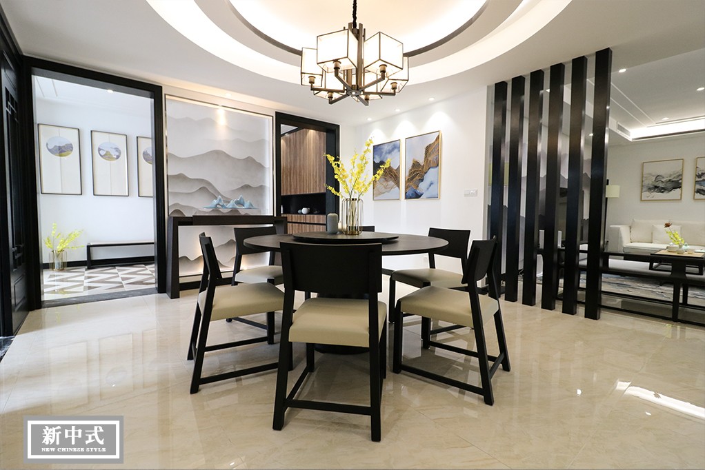 客厅的设计上采用了中式传统的方正、对称式布局,营造出典雅的生活空间。墙面上金属质感的写意装饰,以曲线灵动的美感中和方正空间的板正。灰蓝杂糅的色调点缀其间,为空间中注入一丝的活泼。栅格状的木制装饰营造出明亮的用餐空间。餐厅背景墙面,烟雾朦胧的山间之景,用自然山水的韵律装点空间的雅趣,整个用餐空间清新雅致。