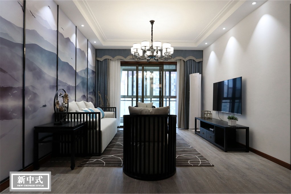 客厅黑白色的基调,衬托地板自然流畅的灰色条纹,将现代居室的雅韵与传统的东方美学巧妙的融合在一起。顶部吊灯的装饰为建筑带来艺术的灵魂,墙面远山的装饰,传递出悠扬的意境。布艺沙发与室内的黑色相协调,简约而精致,凸显现代新中式设计风格与思维,满足现代人对美的理解与精神追求的双重需要。