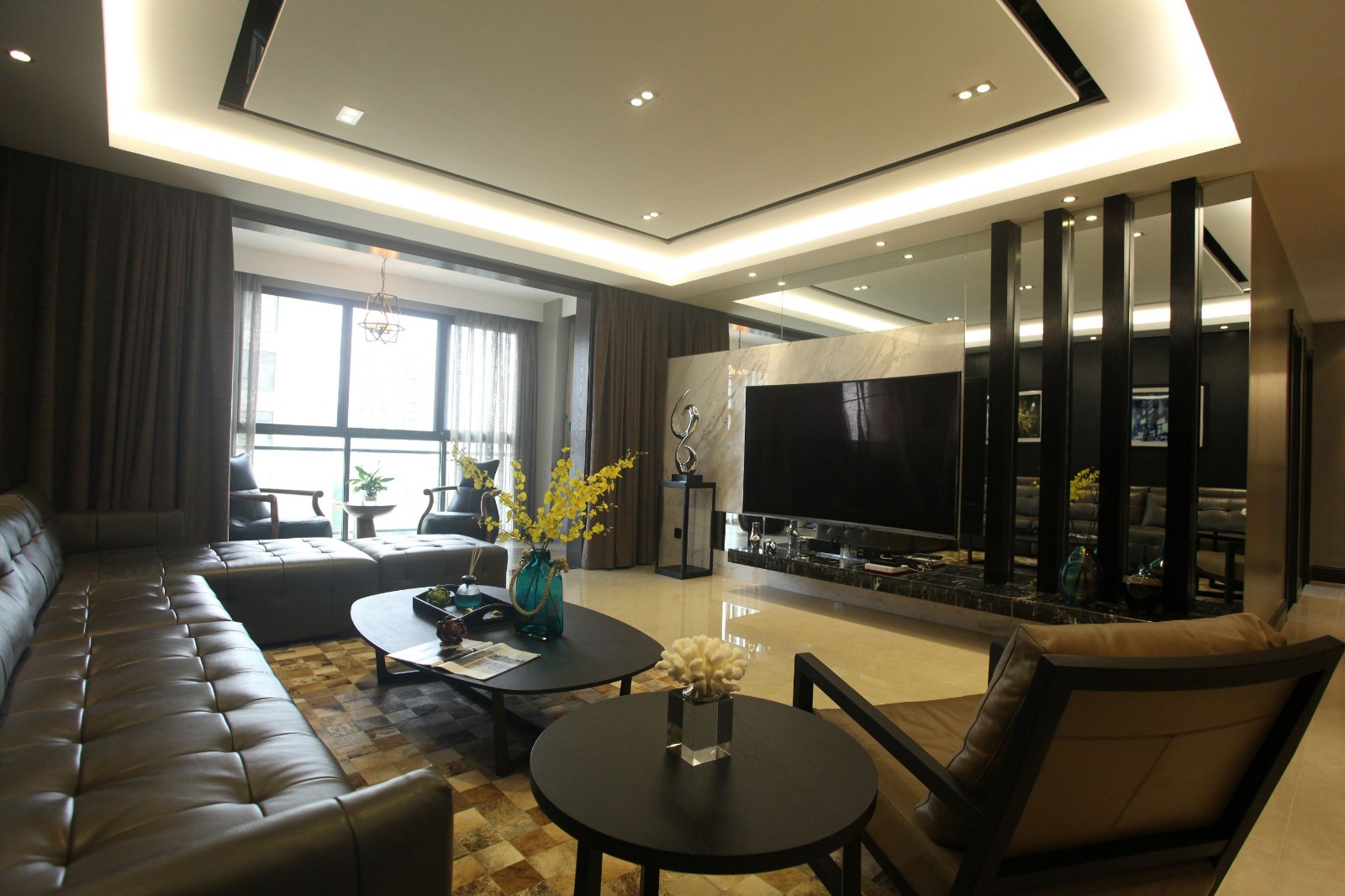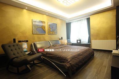 本案的客厅面积较大,配之以黑色的真皮沙发,纯粹的黑色背景墙,扑面而来的稳重感,在于设计师在空间上的把控,更在于客户在时间上的沉淀。主卧延续了客厅的稳重感,没有雕梁画柱,不刻意雕琢,一切仿若自然而生,造化与景。
