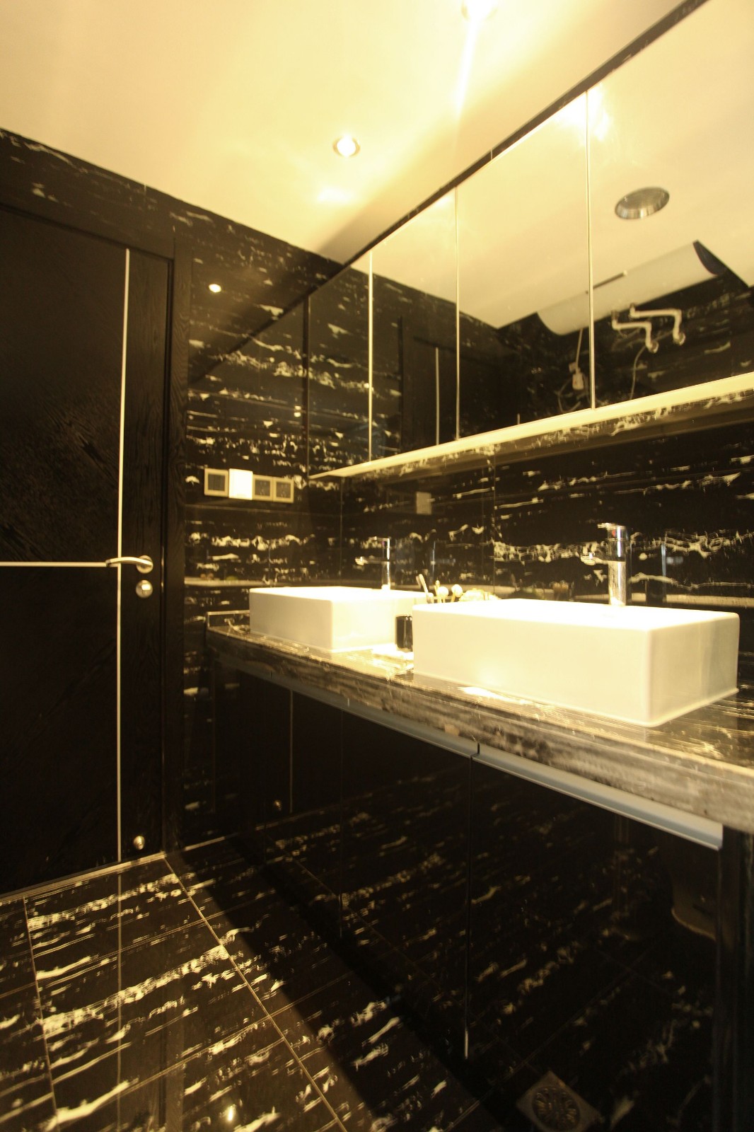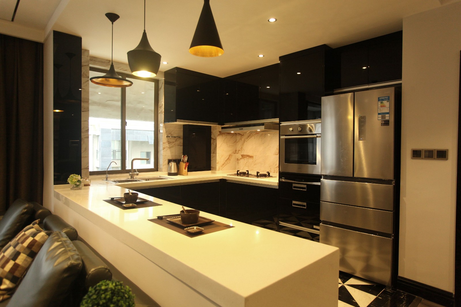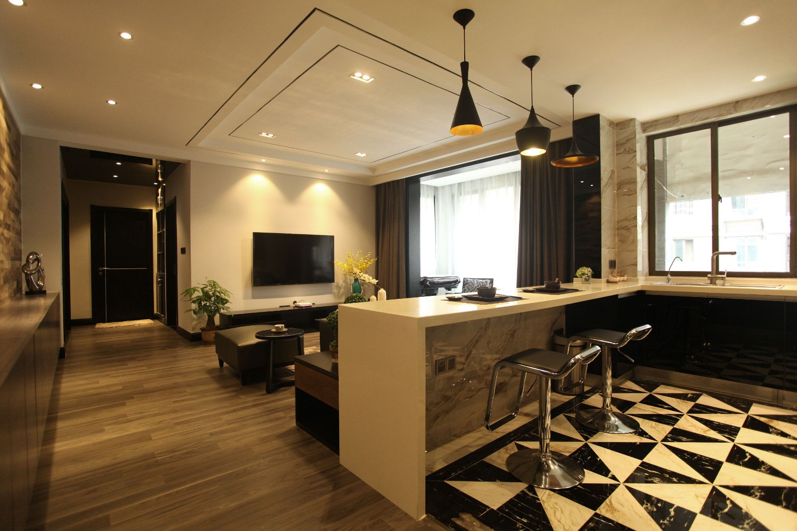由于户型面积较小,设计师考虑到生活空间会显得相对不足,果断抛弃了房子原有的格局,用开放式吧台将客厅和厨房连通,大胆地将厕所面积扩大到原来的一倍。不论是厨房里简单的黑白色地板拼花,还是厕所里的白色双台盆、黑色镜面都是欢快的小提琴音调,混入厚重的大提琴曲,让空间显得更加宽敞。