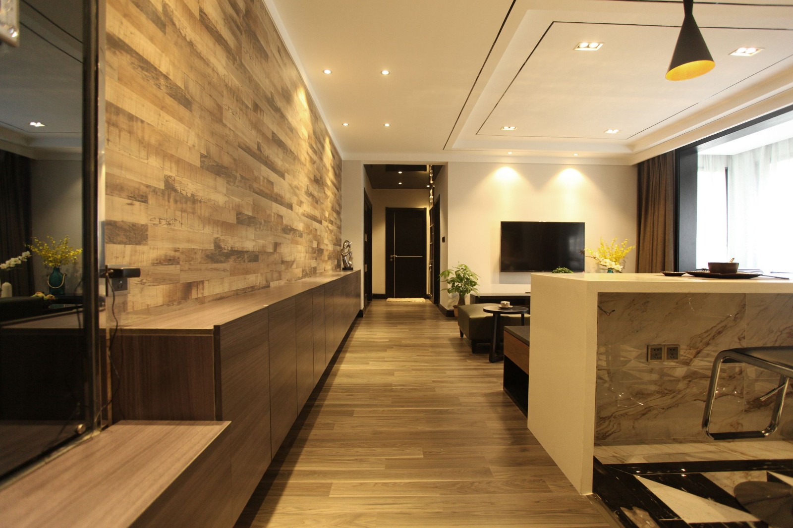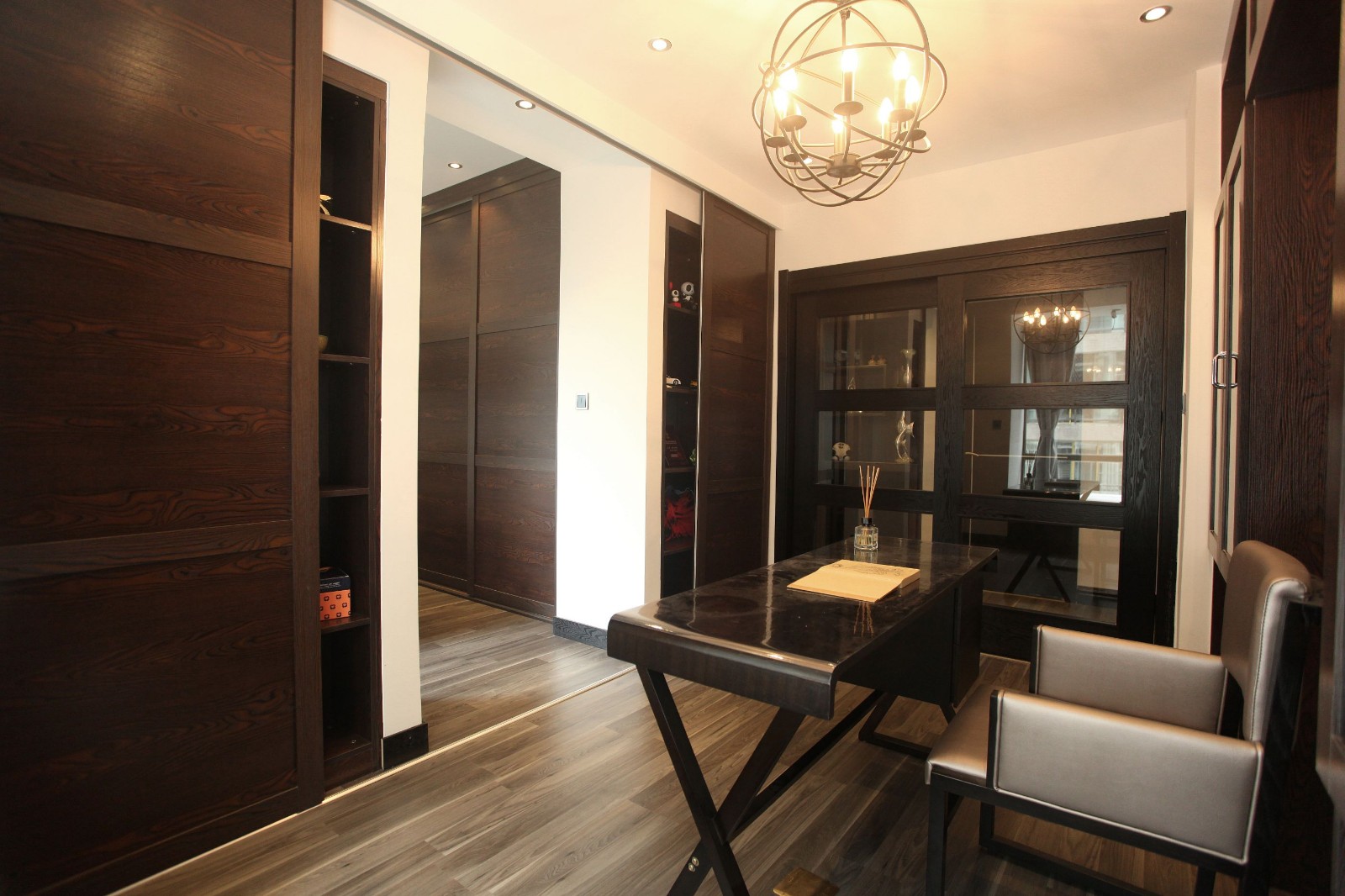 设计师在本案中以深咖啡色、黑色的基调打造了一间简约豪宅。少量木元素的应用在时光中有着厚重的沉淀感,在与大量深咖啡色、黑色的交织中,谱写的是一曲浑厚丰满的大提琴曲。