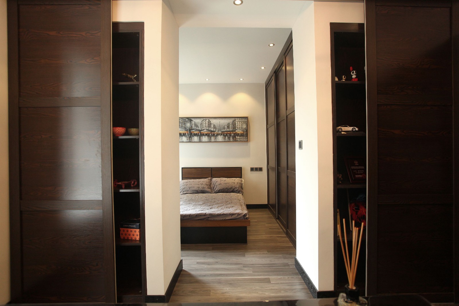 整体书房在静谧的时光中稍显孤单,但是推开书桌对面的柜门,就会发现设计师给了生活一个惊喜,柜门后面是供阅读者休息之地。生活的惊喜在于,在简单中藏着一点小小的复杂,保持着一点低调的神秘。