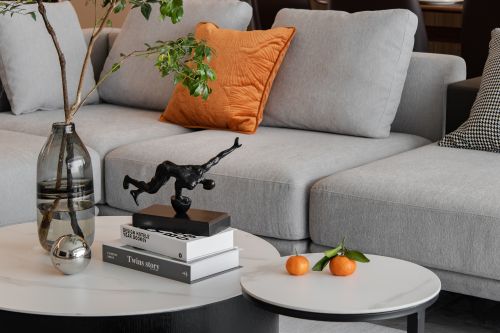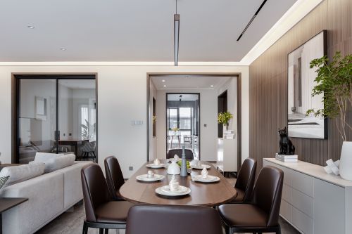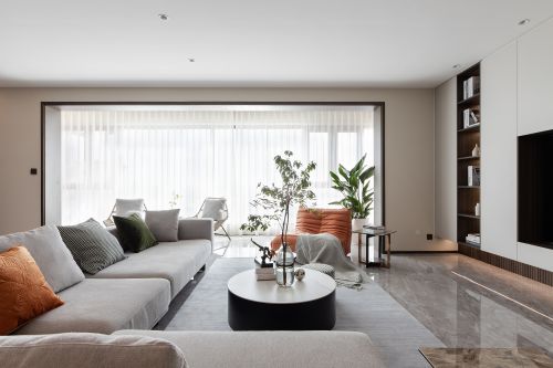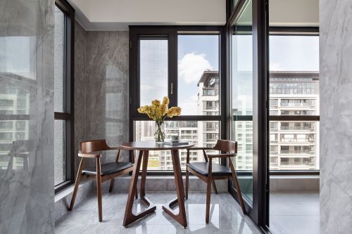 客厅是家庭互动的核心区域, 在保持原户型大横厅格局的基础上,设计师调整书房门与客厅联通,从空间动线上增加了家人互动的频率,并且空间更开阔,空气更流通。 考虑到屋主二人生活的便利性,设计师在阳台区域摆放了一组圆形木质桌椅,方便日常使用的同时又多了一份生活的惬意。