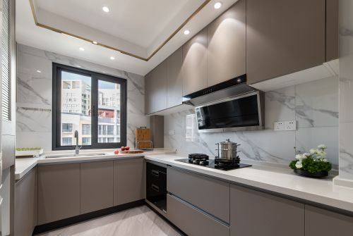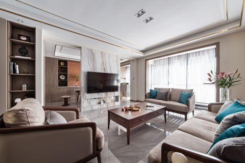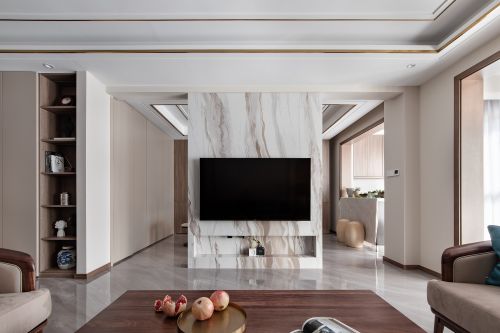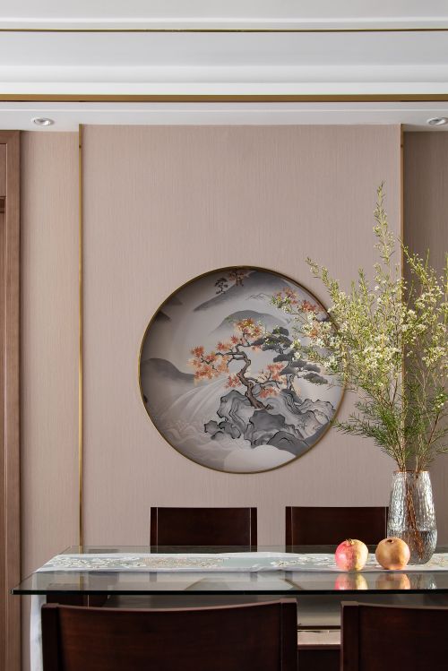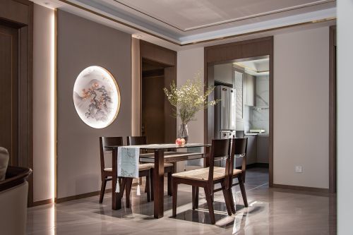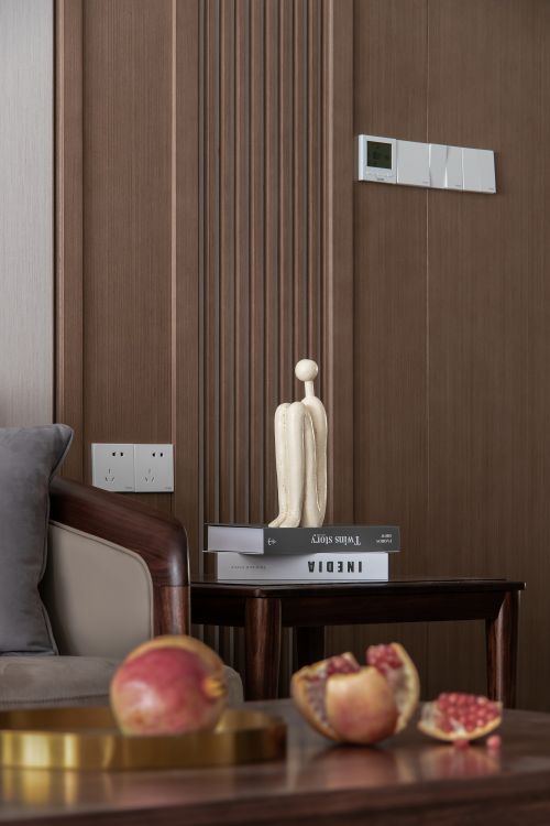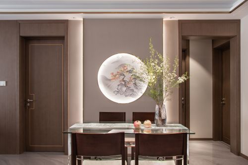 本案整体的色调是采用一个奶茶色和颜色较深的咖色木纹来做搭配,同时软装上将新中式中比较潮流的一个元素融合在里面。