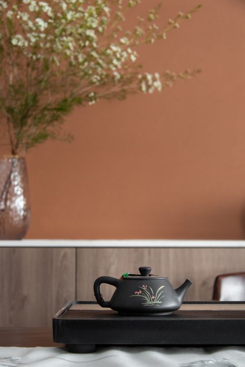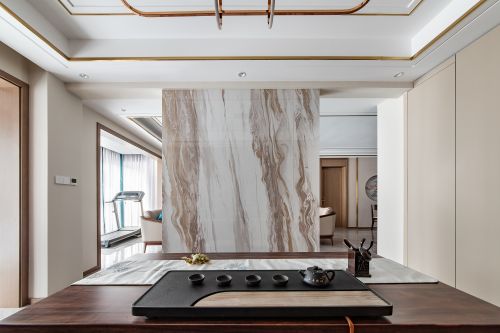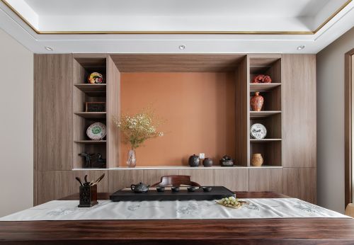 ①本案设计师把紧邻客厅的一个卧室打开,做成了茶室。采用一个环形动线的方法让茶室跟客厅有一个互动联系的地方。