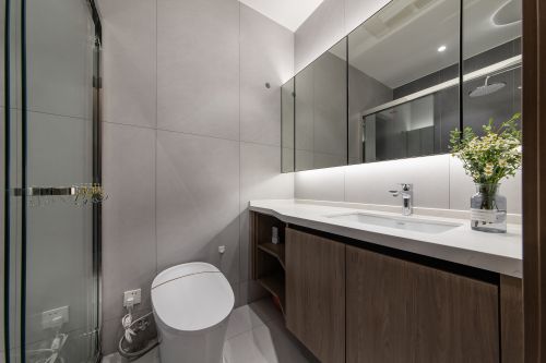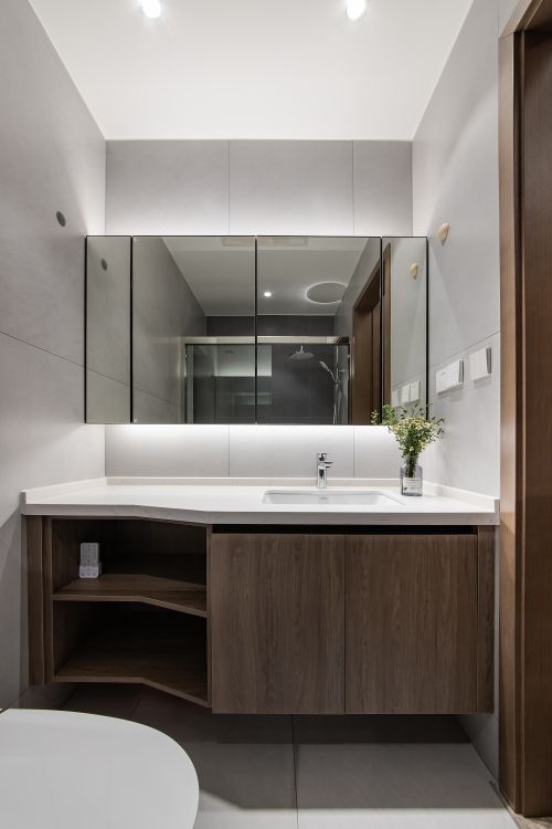 ②次卫原本的一个洗漱区域在过道外,通过利用墙体往外移的方式,把我们的淋浴盆和马桶,还有淋浴区都归纳在卫生间里面。所空出来的过道,这个地方做了一大个储物柜,可以放置水暖的水箱。
