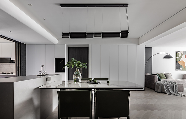 时尚与实用的融合餐厅最吸睛的当属带岛台的设计。黑白配色的岛台与餐桌相连,