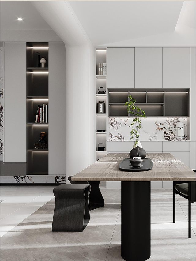- 餐厨区:白岩板中岛+暖木柜,搭配金属线条吊灯,做饭时的烟火气都变高级;
