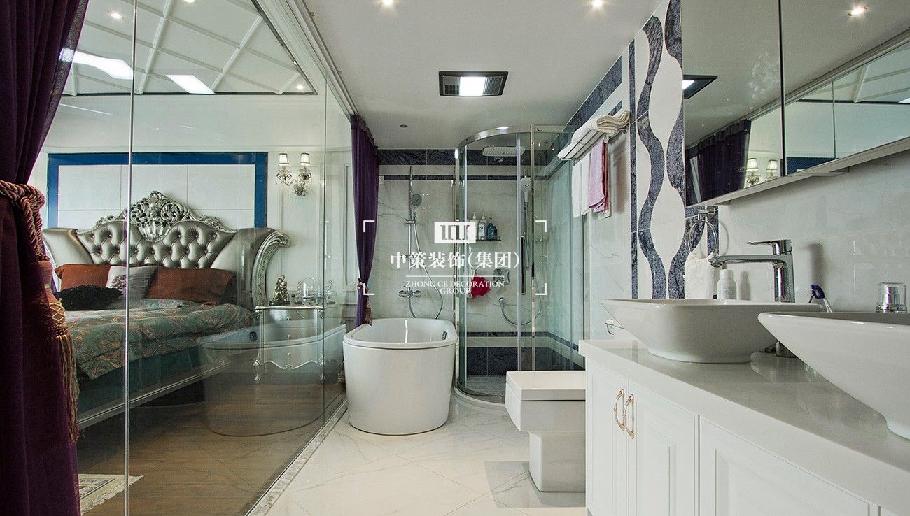 主卧也尽显大气和奢华。无论是用料考究的暗纹床品,还是皮质优越的深蓝色沙发,亦或是嵌入大理石墙面内的液晶电视,都让整个空间显得充实而不俗。而全开放式的透明玻璃主卫,完全与主卧连接在一起,增加了房间通透感的同时,更充满了现代感的诱惑。由于主人衣帽饰品较多,所以特地在卧室入口增加了一排透明橱柜,用来摆放鞋、包等贵重饰品,搭配衣帽间一起使用,更多了一丝高雅格调!